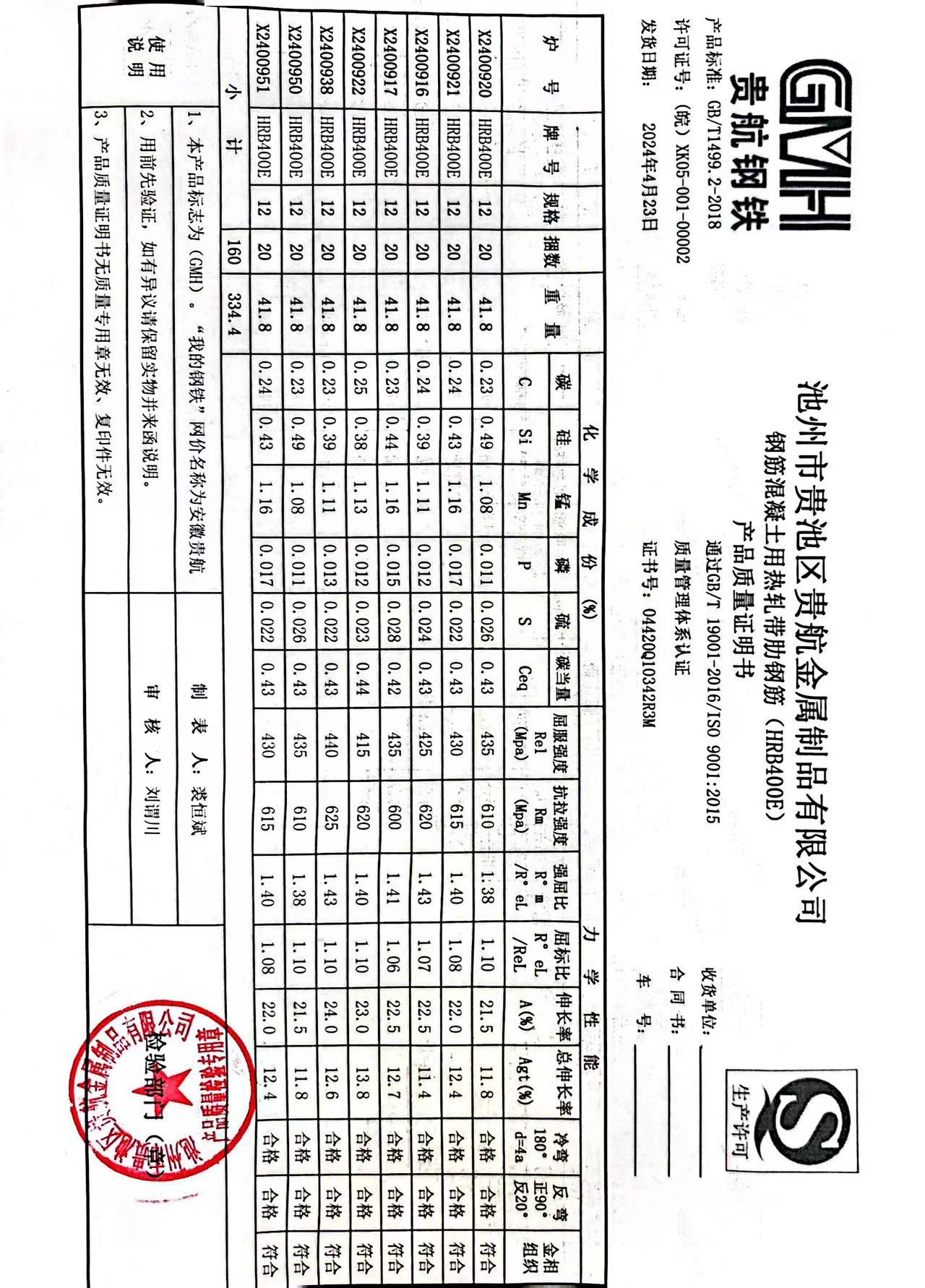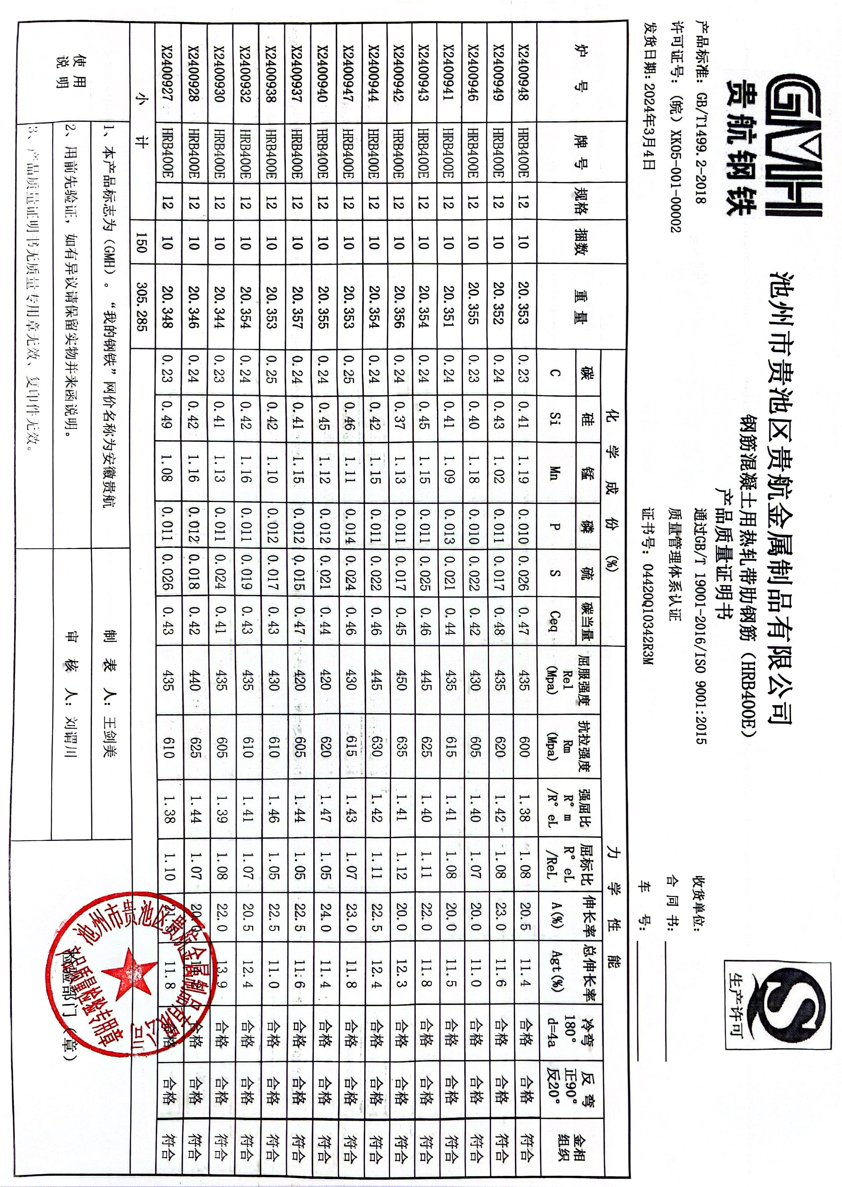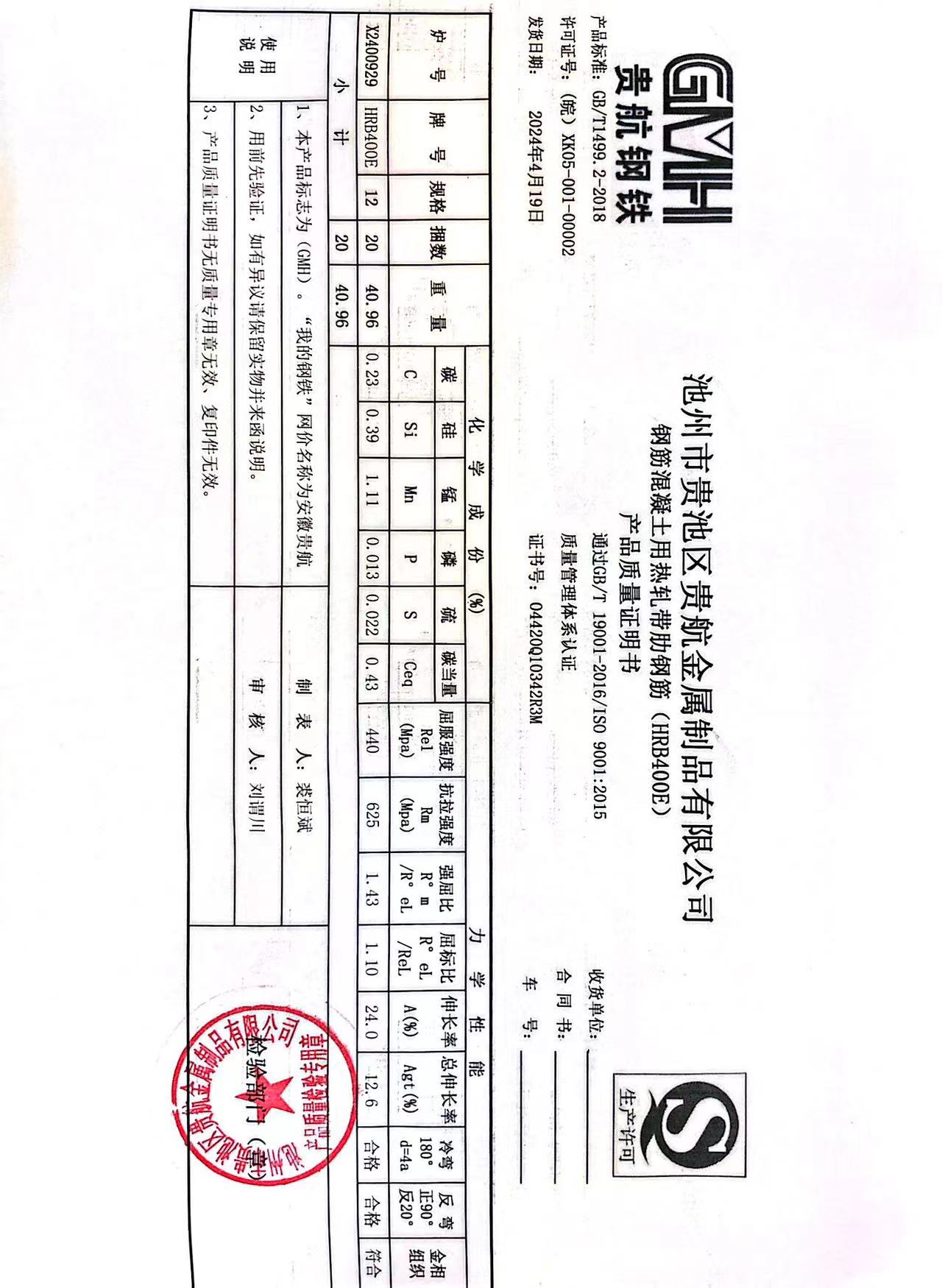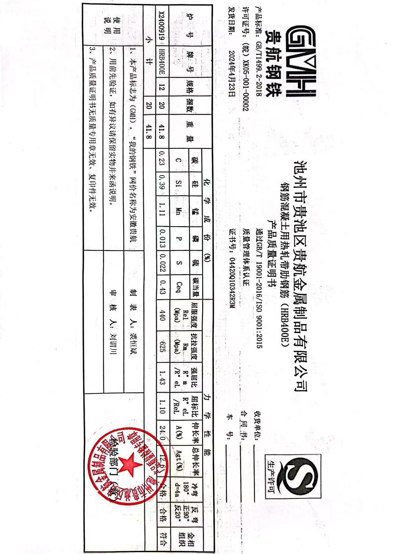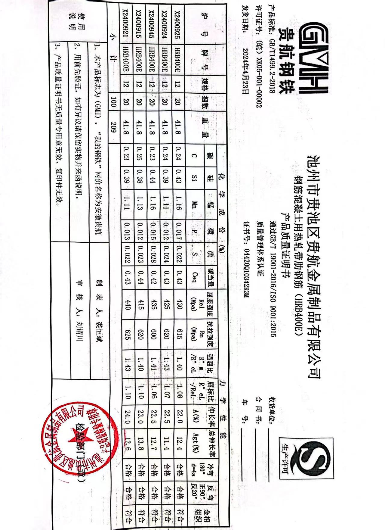 安徽省贵航特钢有限公司GH/JL-JZ-45提货单位:上海登钢商贸有限公司3、如发现产品质重问题,请在验收后5天内向我公司质里科提出异议并保留实物,等我公司审验后处理,擅自使用我公司不负任何责任。