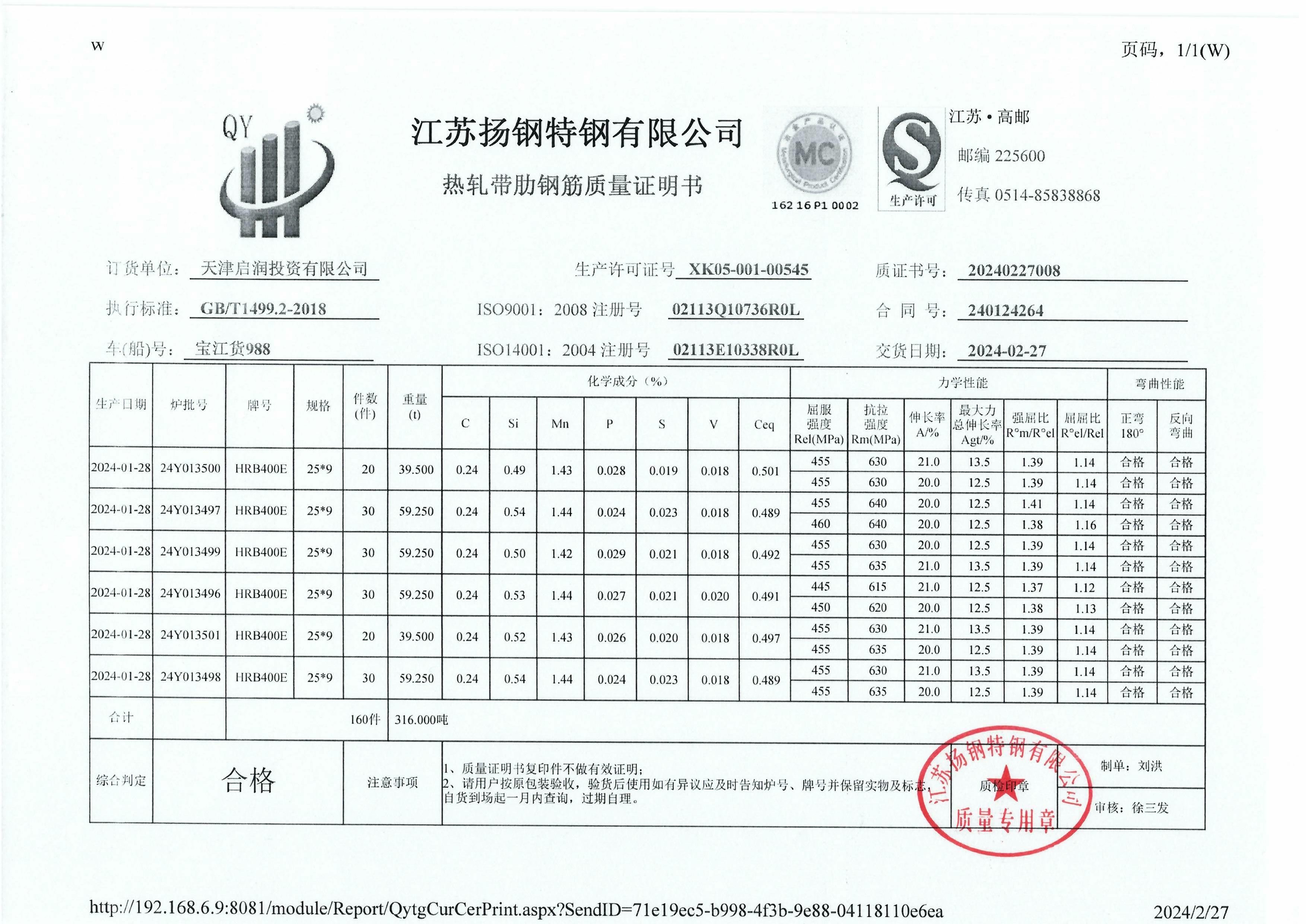 丹阳龙江钢铁有限公司质量证明书天津启润投资有限公司