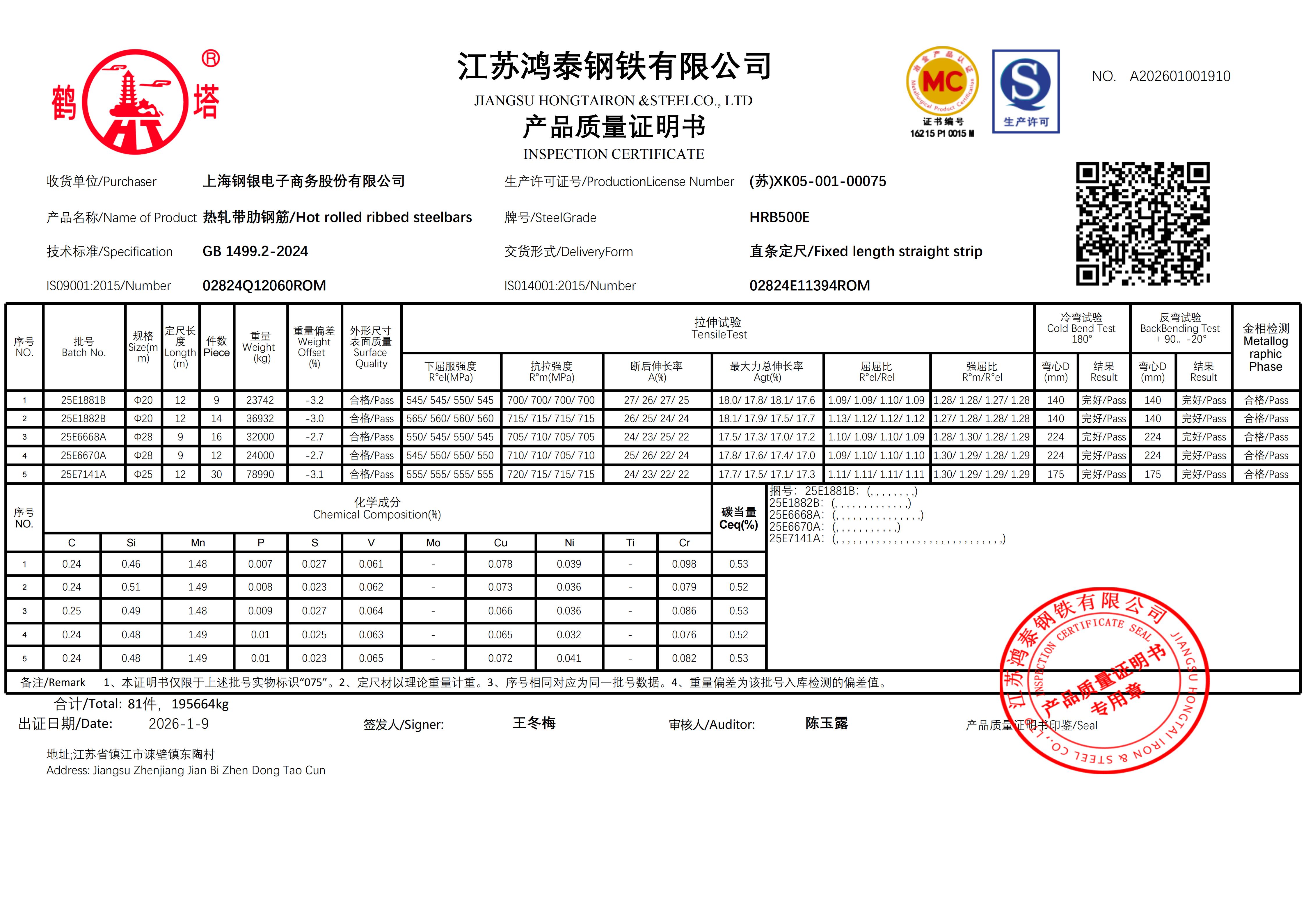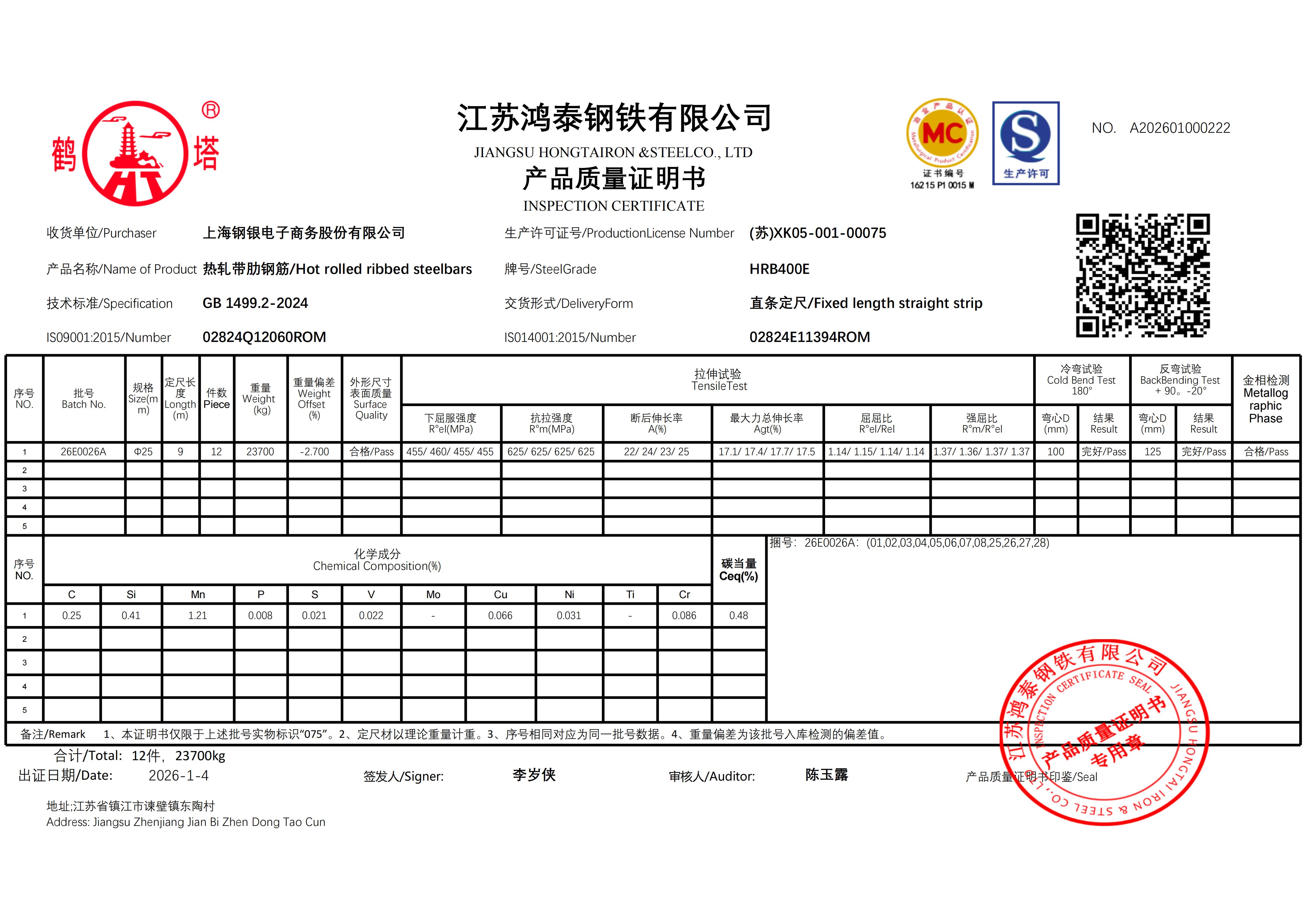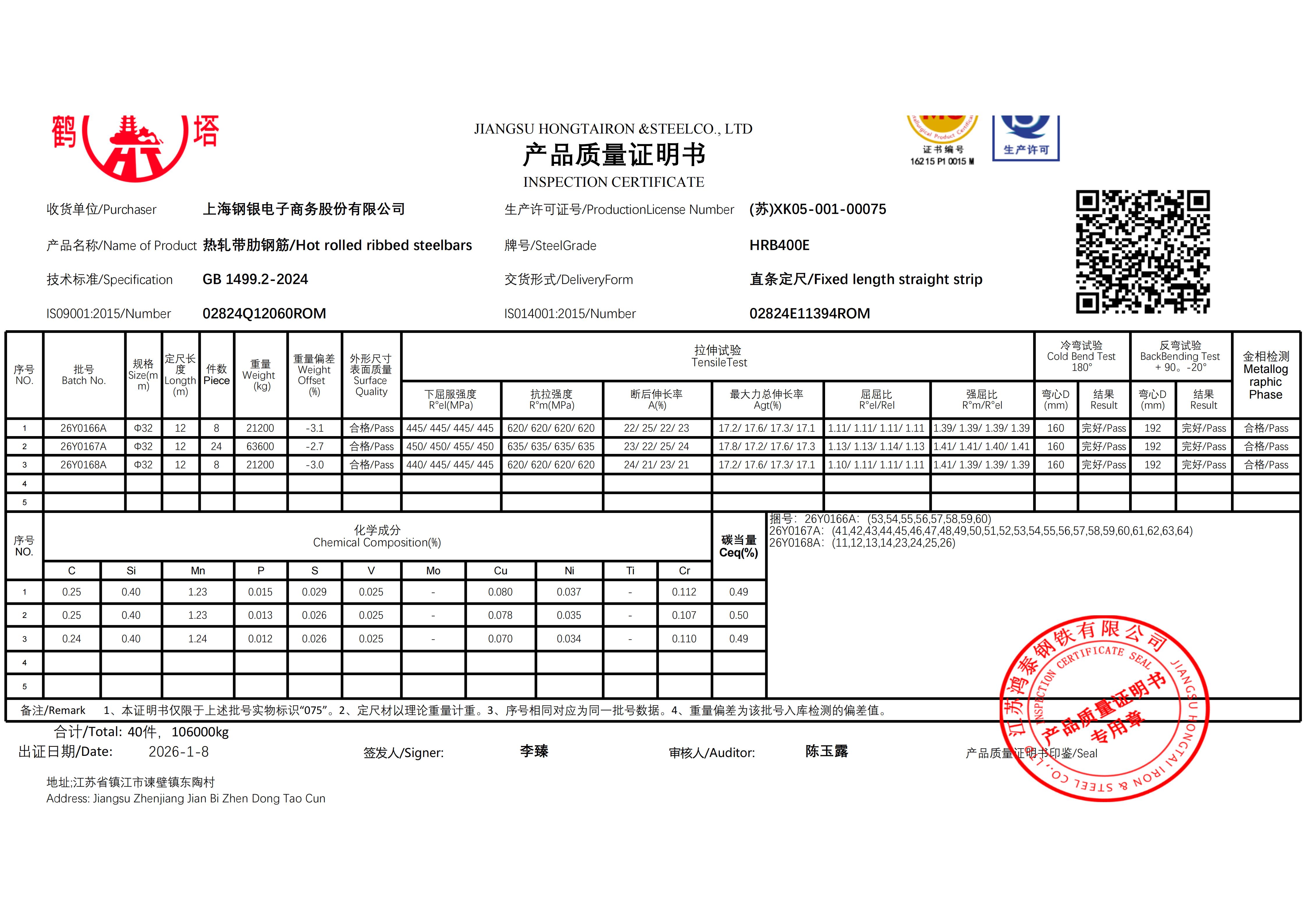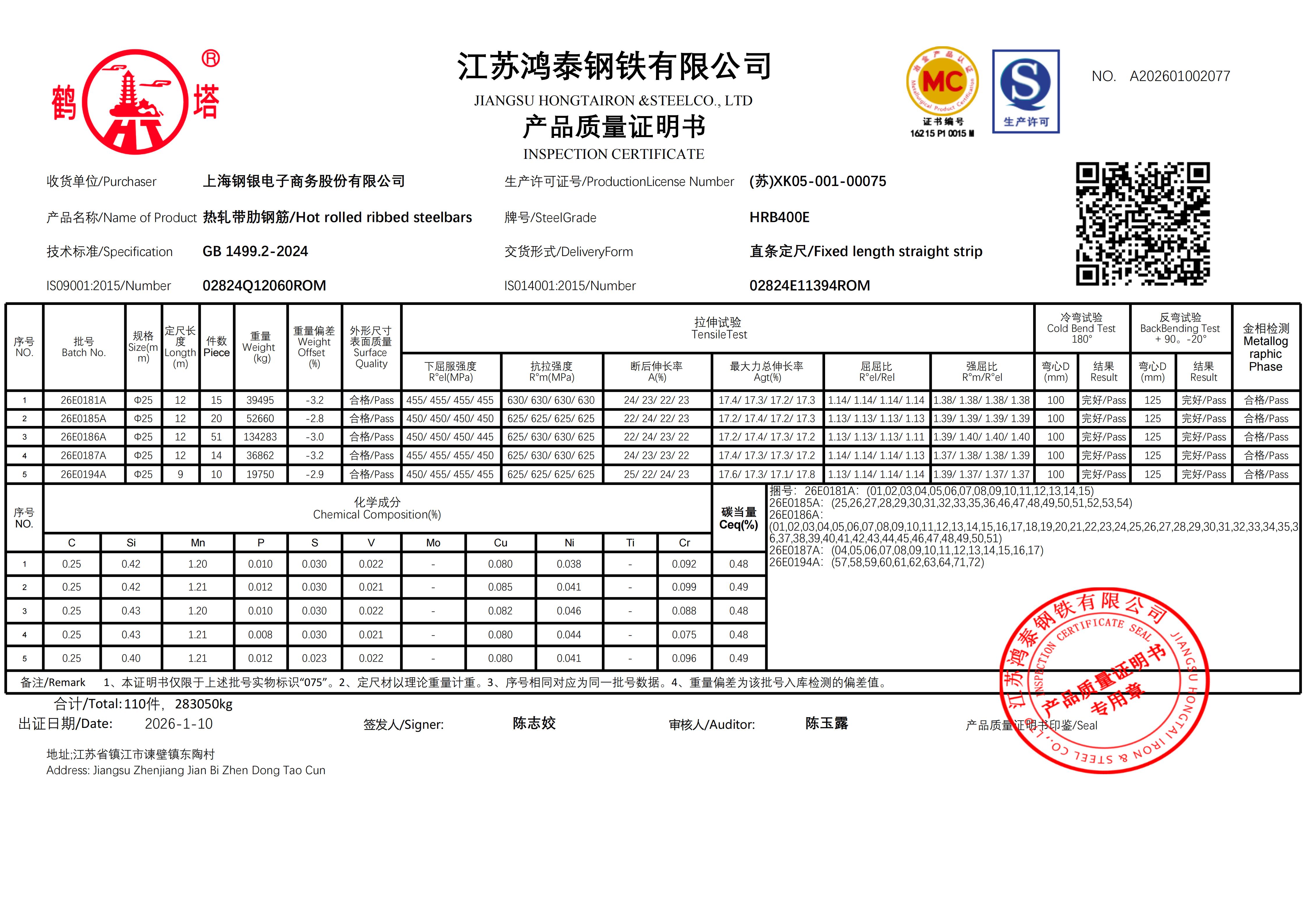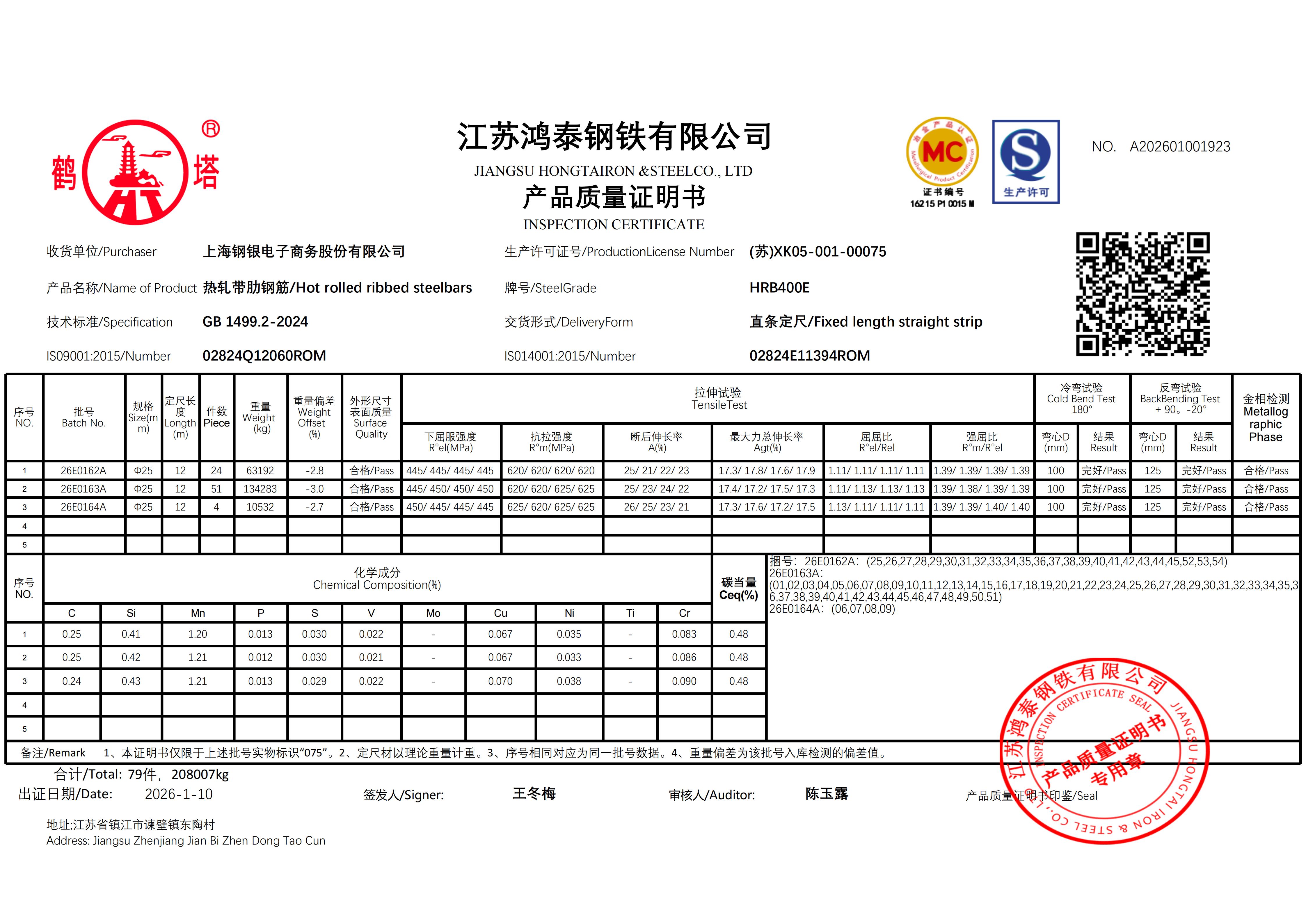江苏鸿泰钢铁有限公司 A202601001924上海钢银电子商务股份有限公司NO