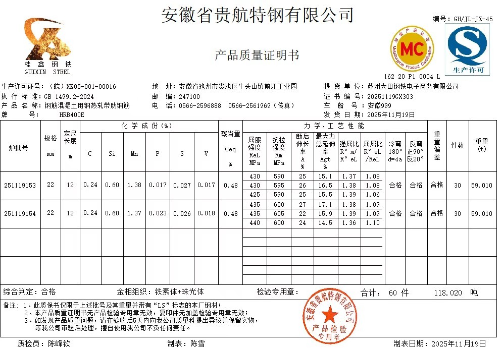 安徽省贵航特钢有限公司GH/JL-JZ-45提货单位:苏州大田钢铁电子商务有限公司3、如发现产品质量问题,请在验收后5天内向我公司质量科提出异议并保留实物,等我公司审验后处理,擅自使用我公司不负任何责任。