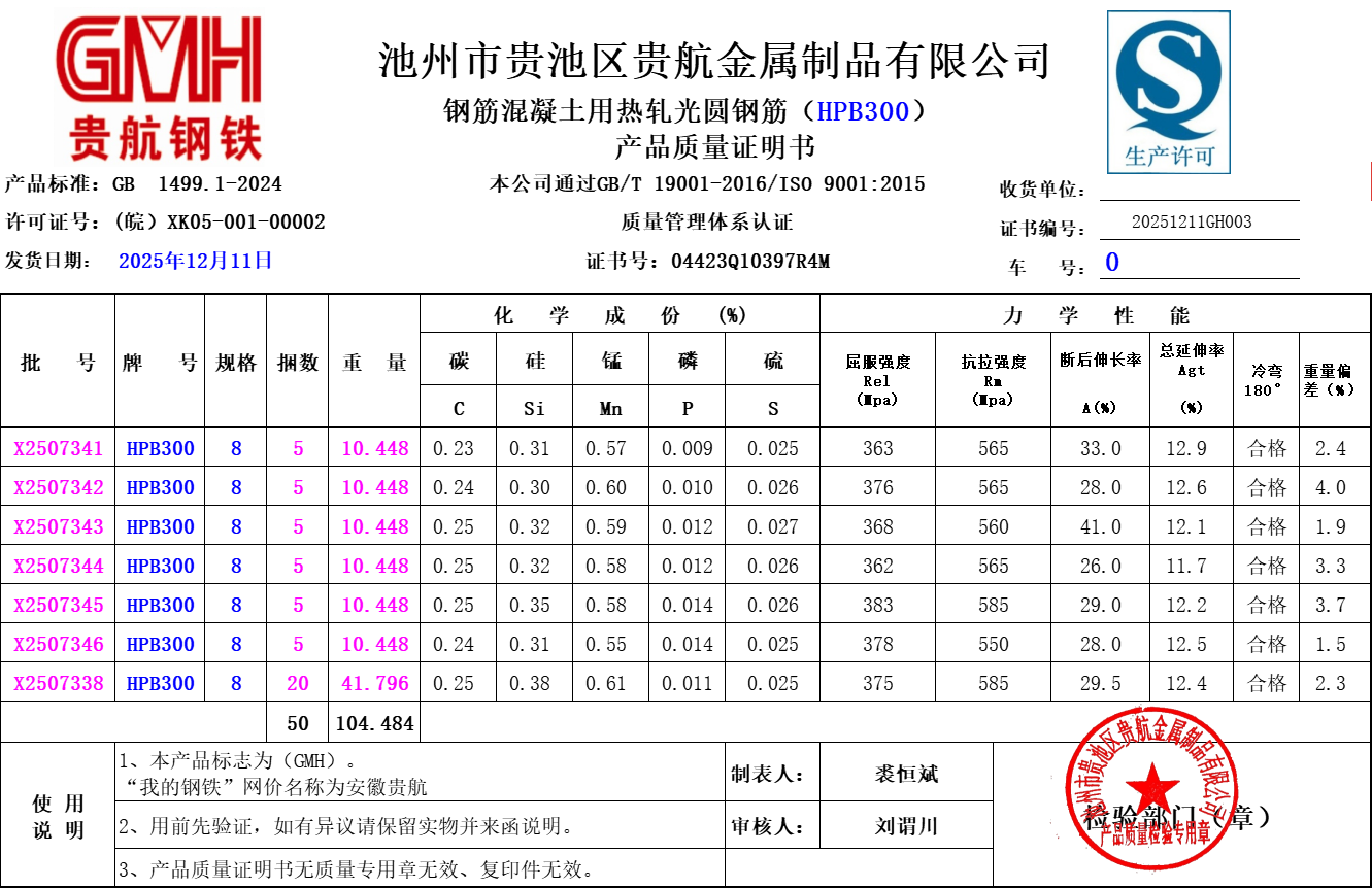 安徽省贵航特钢有限公司GH/JL-JZ-45提货单位:陕西建工材料设备物流集团有限公司3、如发现产品质量问题,请在验收后5天内向我公司质量科提出异议并保留实物,等我公司审验后处理,擅自使用我公司不负任何责任。