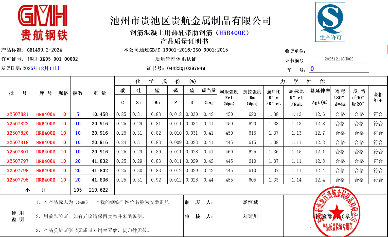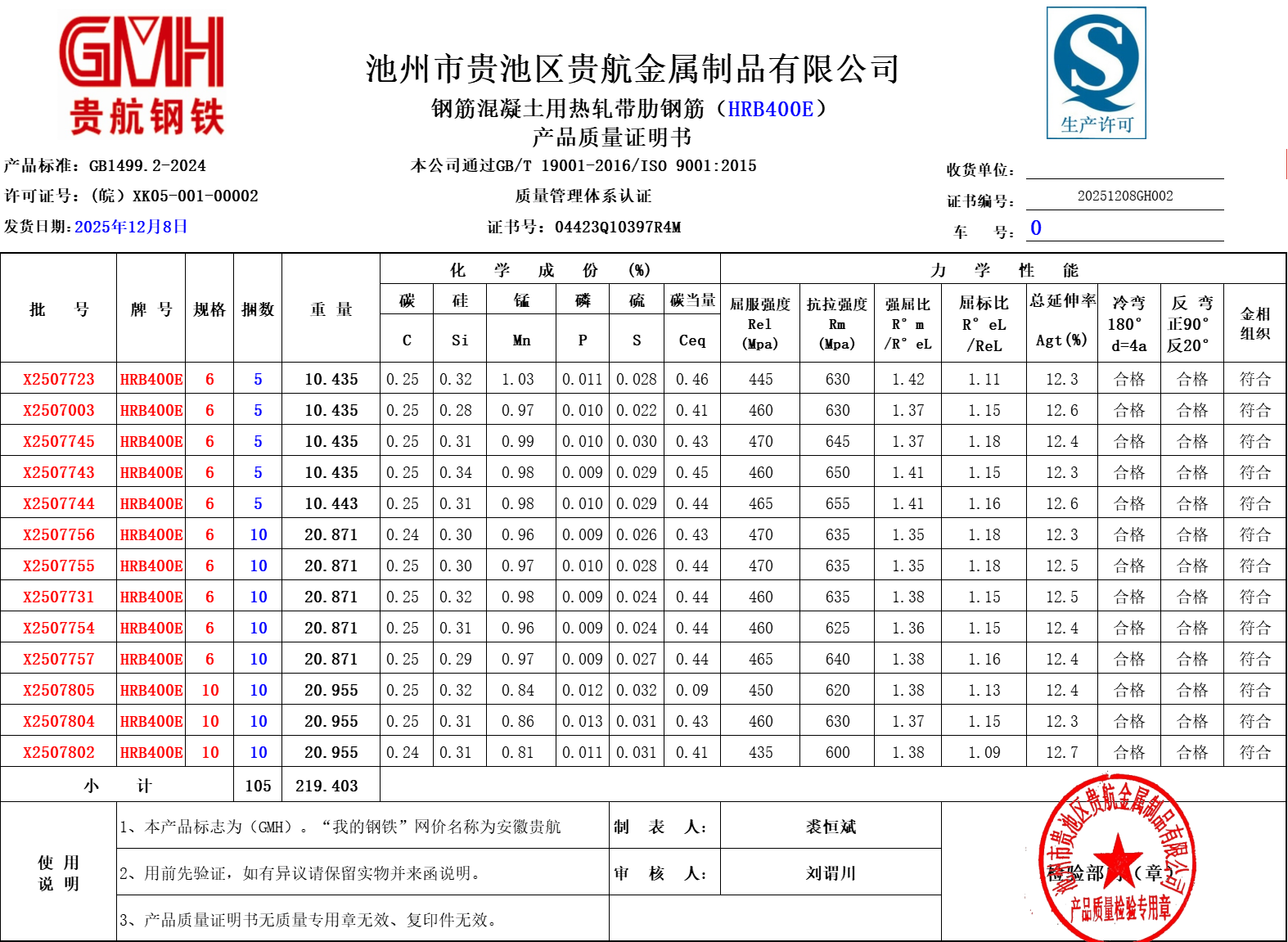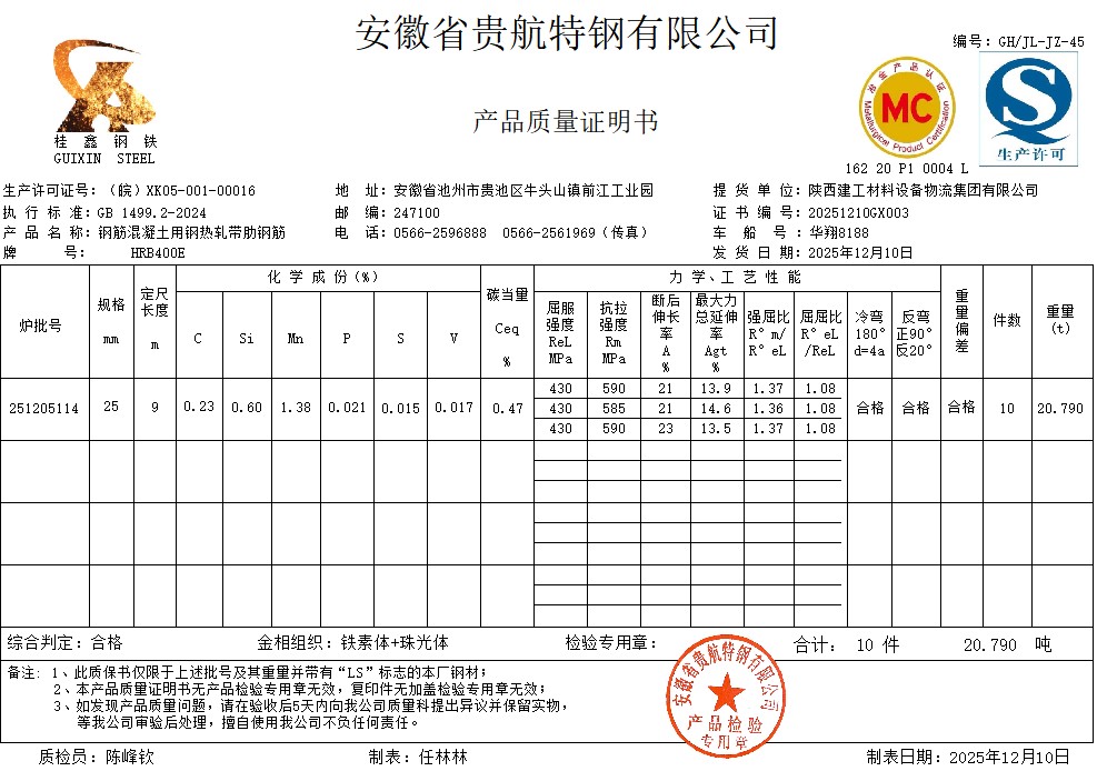 安徽省贵航特钢有限公司GH/JL-JZ-45提货单位:陕西建工材料设备物流集团有限公司3、如发现产品质量问题,请在验收后5天内向我公司质量科提出异议并保留实物,等我公司审验后处理,擅自使用我公司不负任何责任。