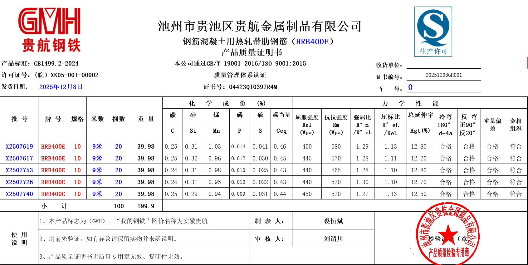 安徽省贵航特钢有限公司GH/JL-JZ-45提货单位:陕西建工材料设备物流集团有限公司3、如发现产品质量问题,请在验收后5天内向我公司质量科提出异议并保留实物,等我公司审验后处理,擅自使用我公司不负任何责任。