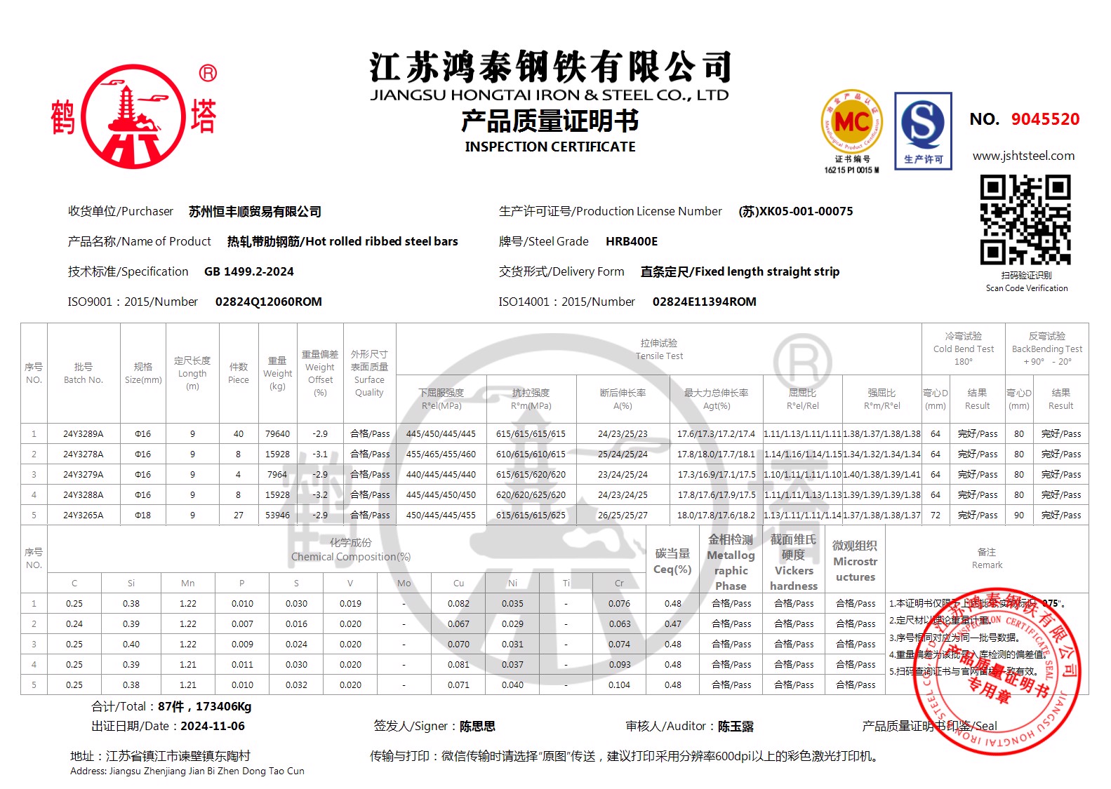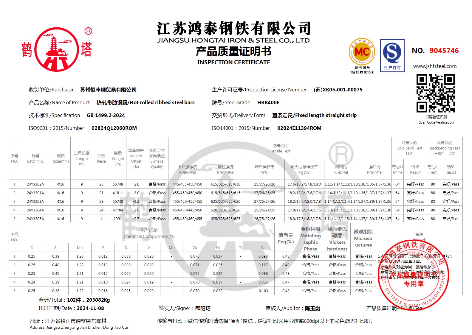 江苏鸿泰钢铁有限公司9047431收货单位/Purchaser苏州恒丰顺贸易有限公司