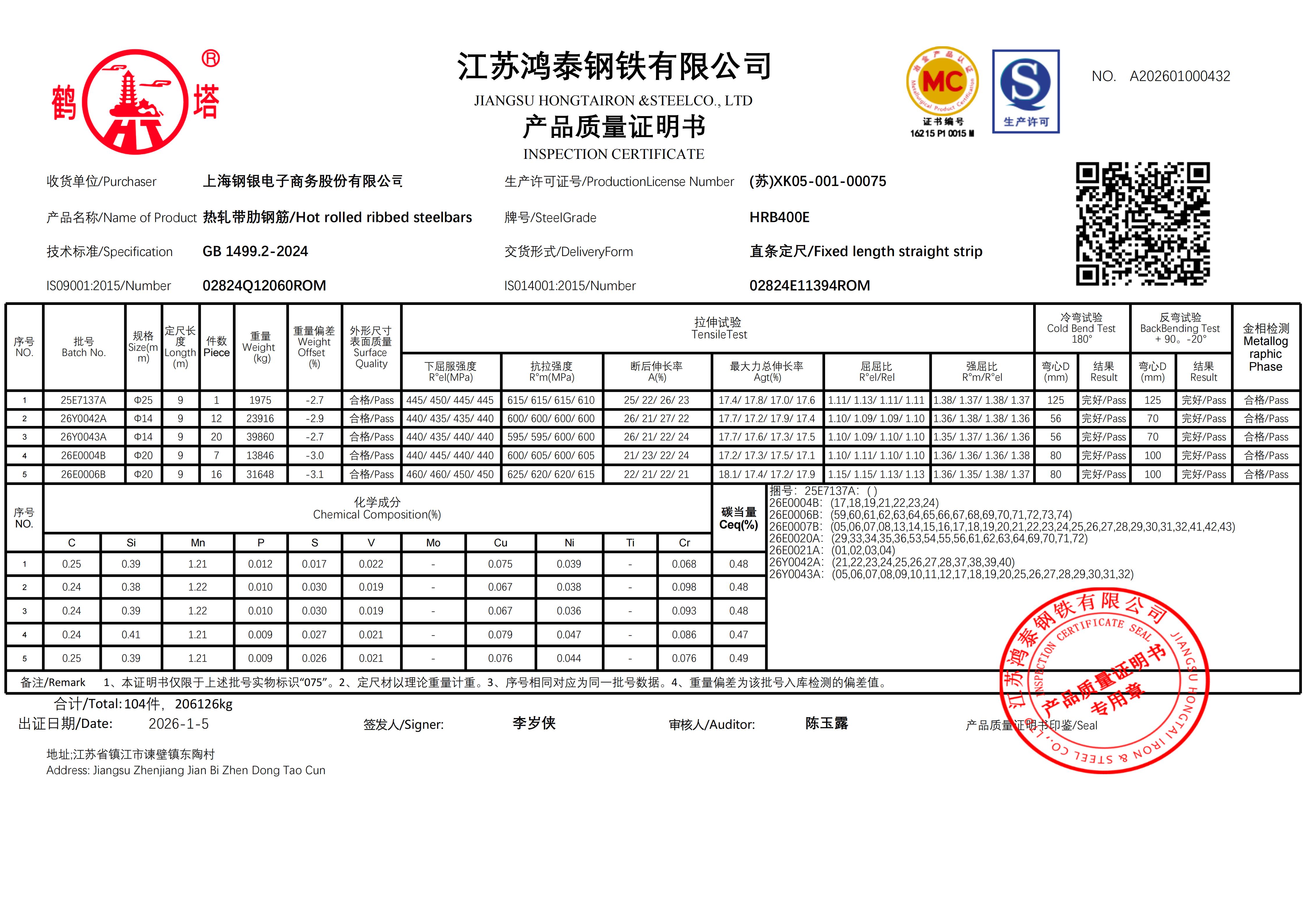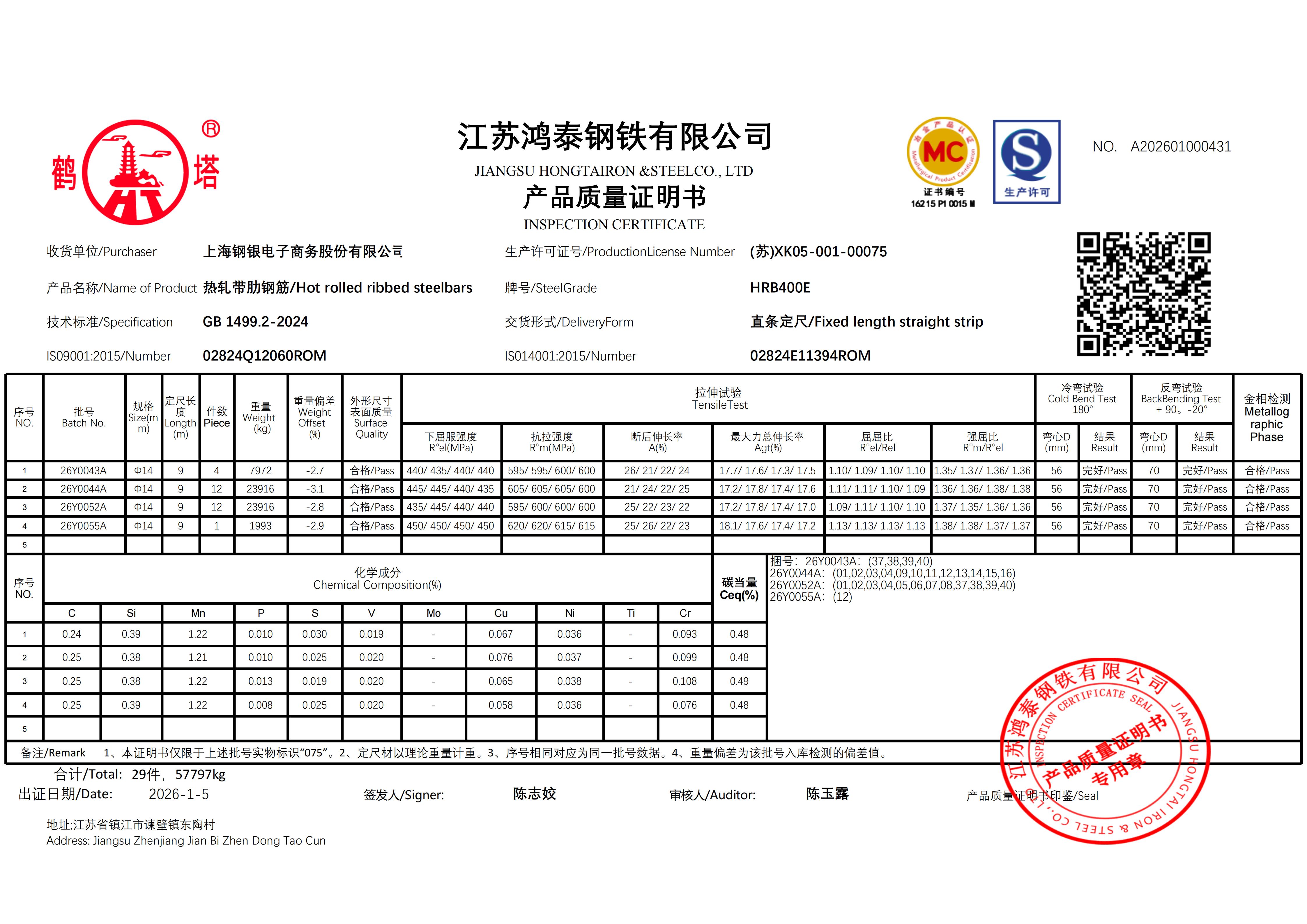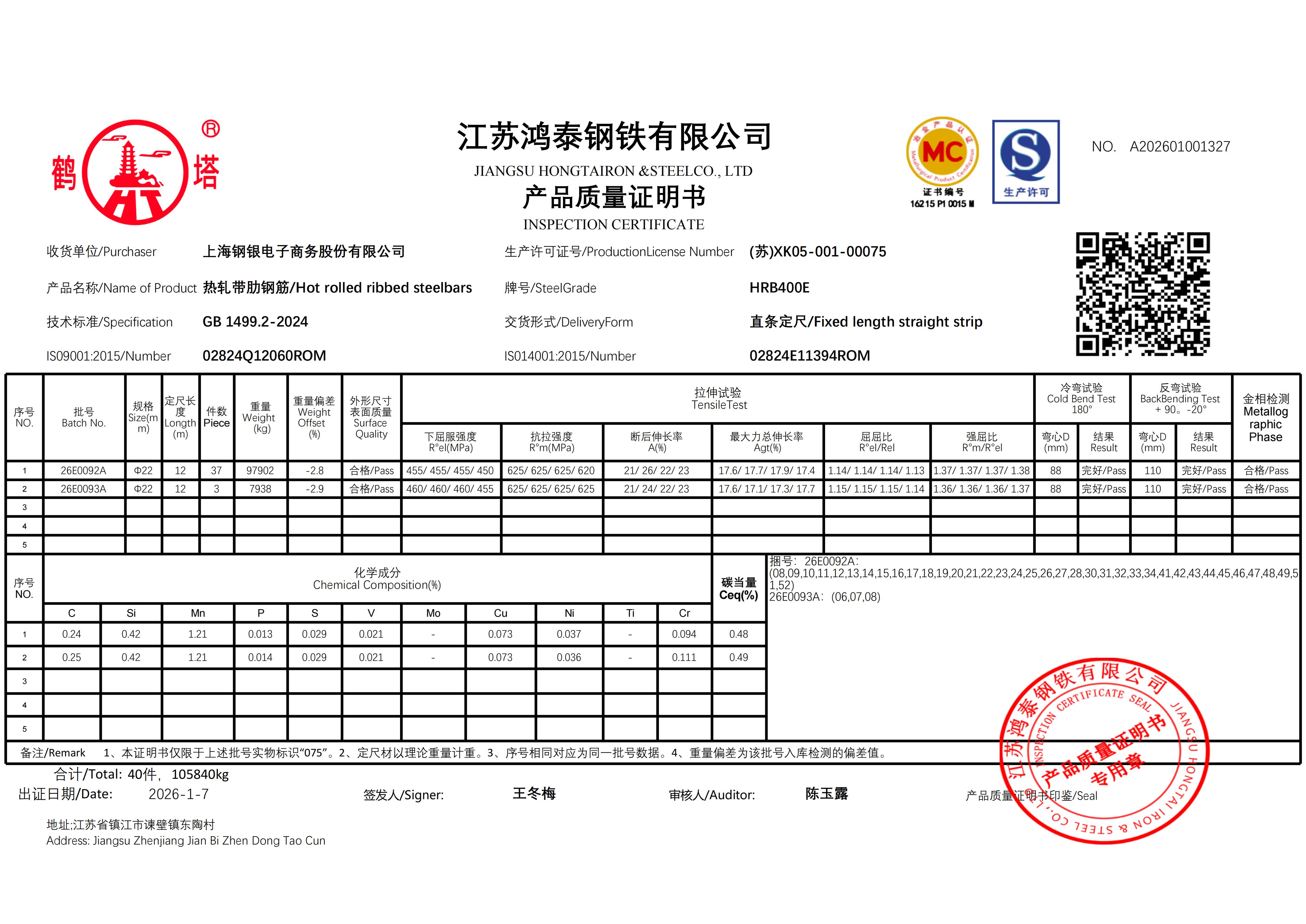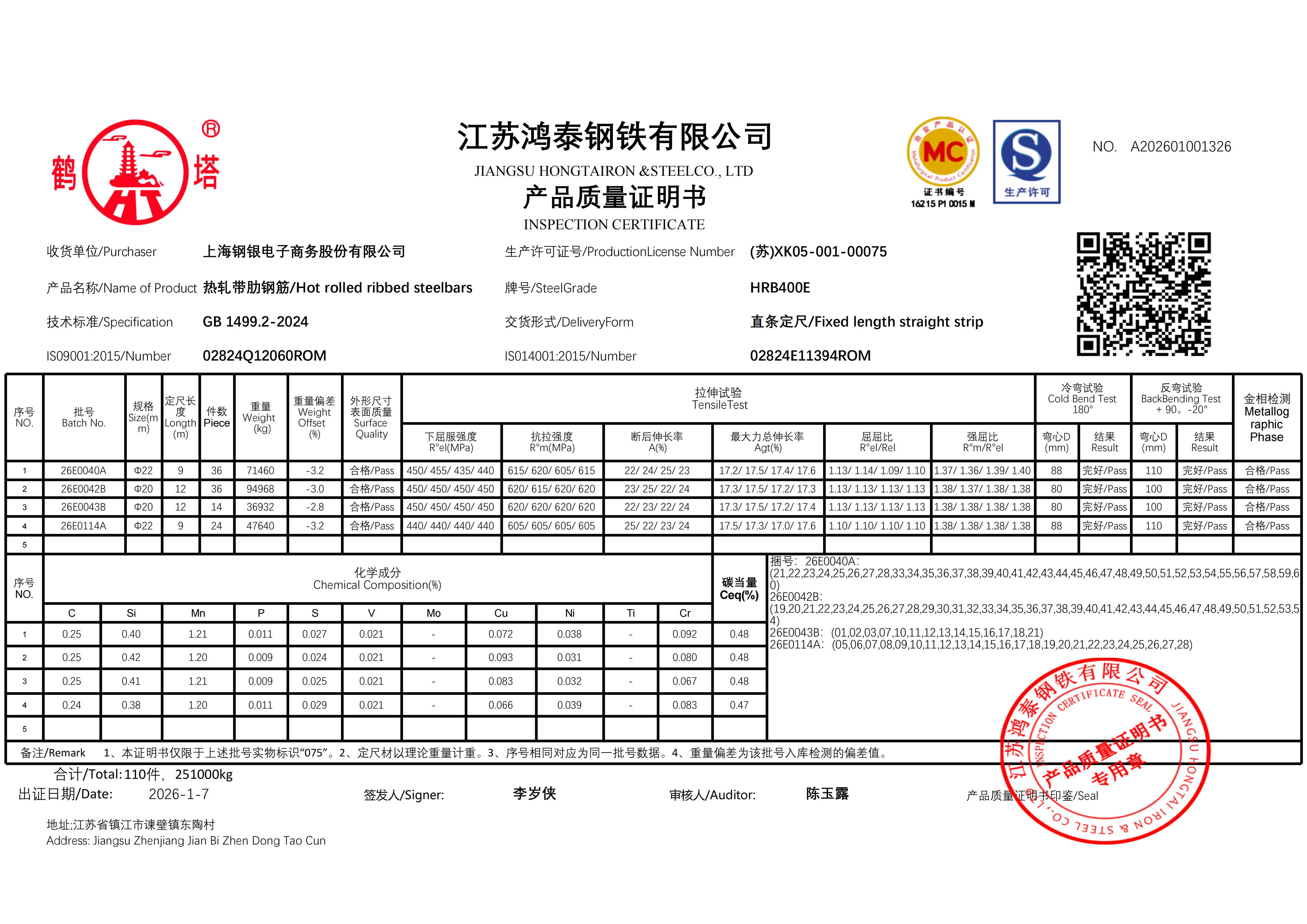 江苏鸿泰钢铁有限公司 A202601001326上海钢银电子商务股份有限公司NO