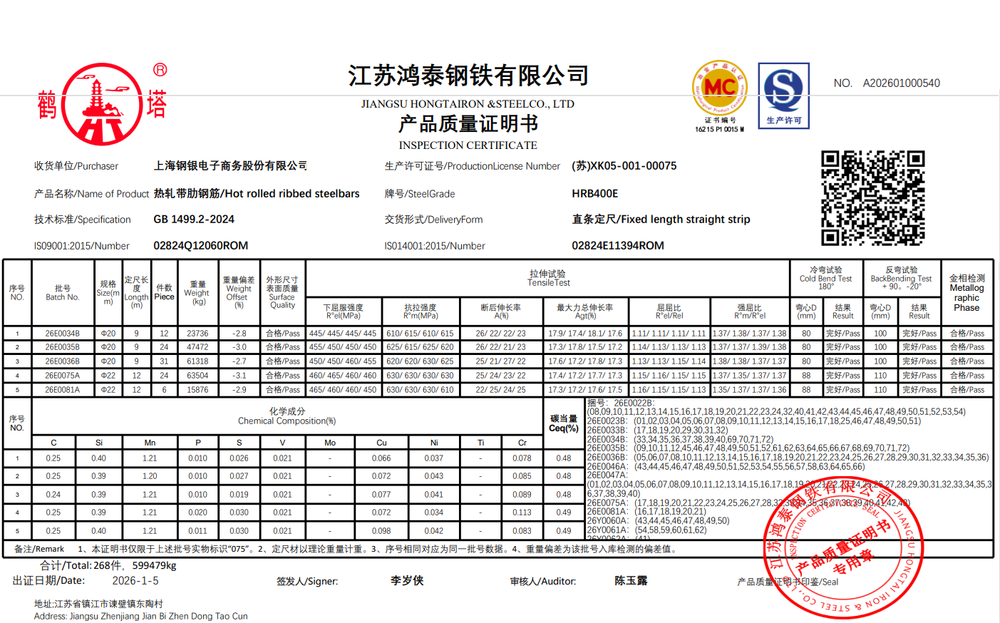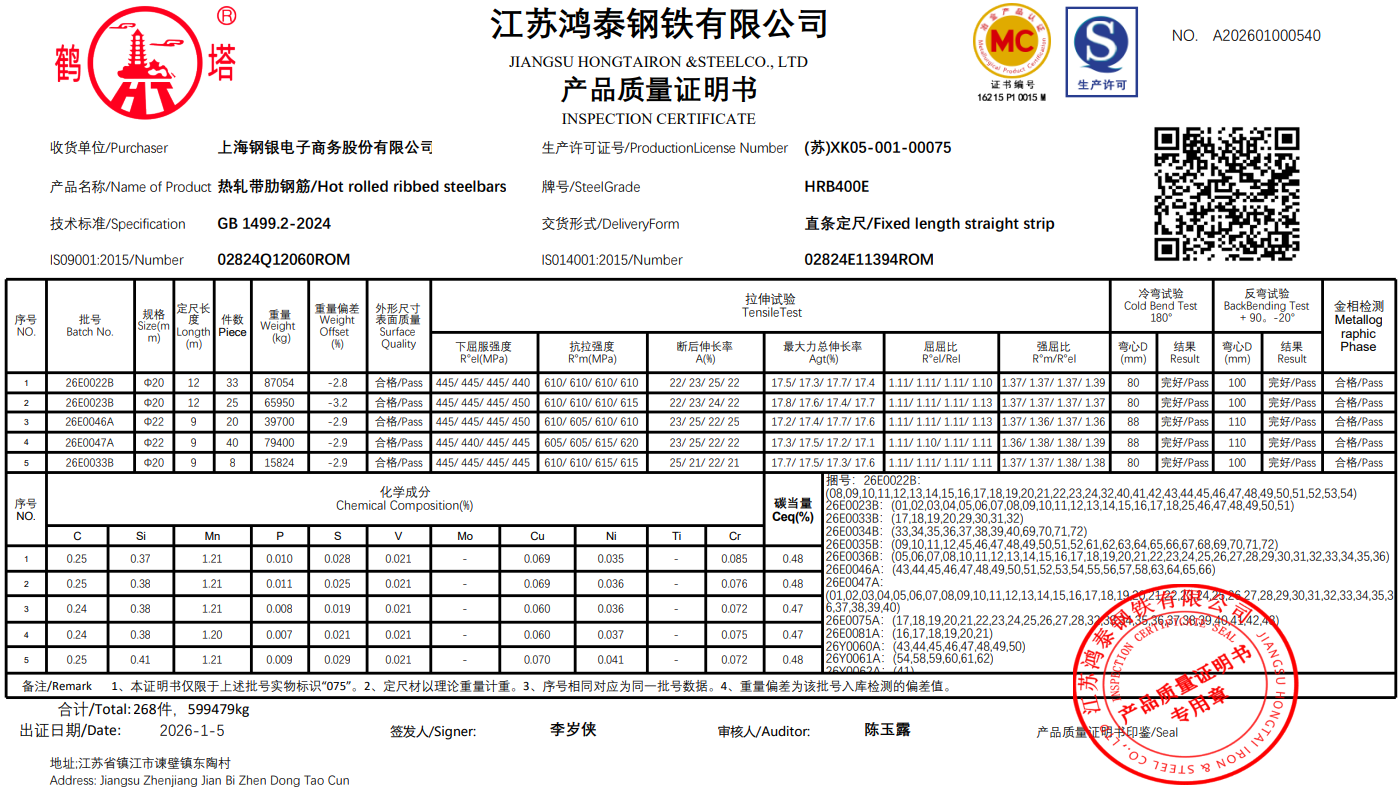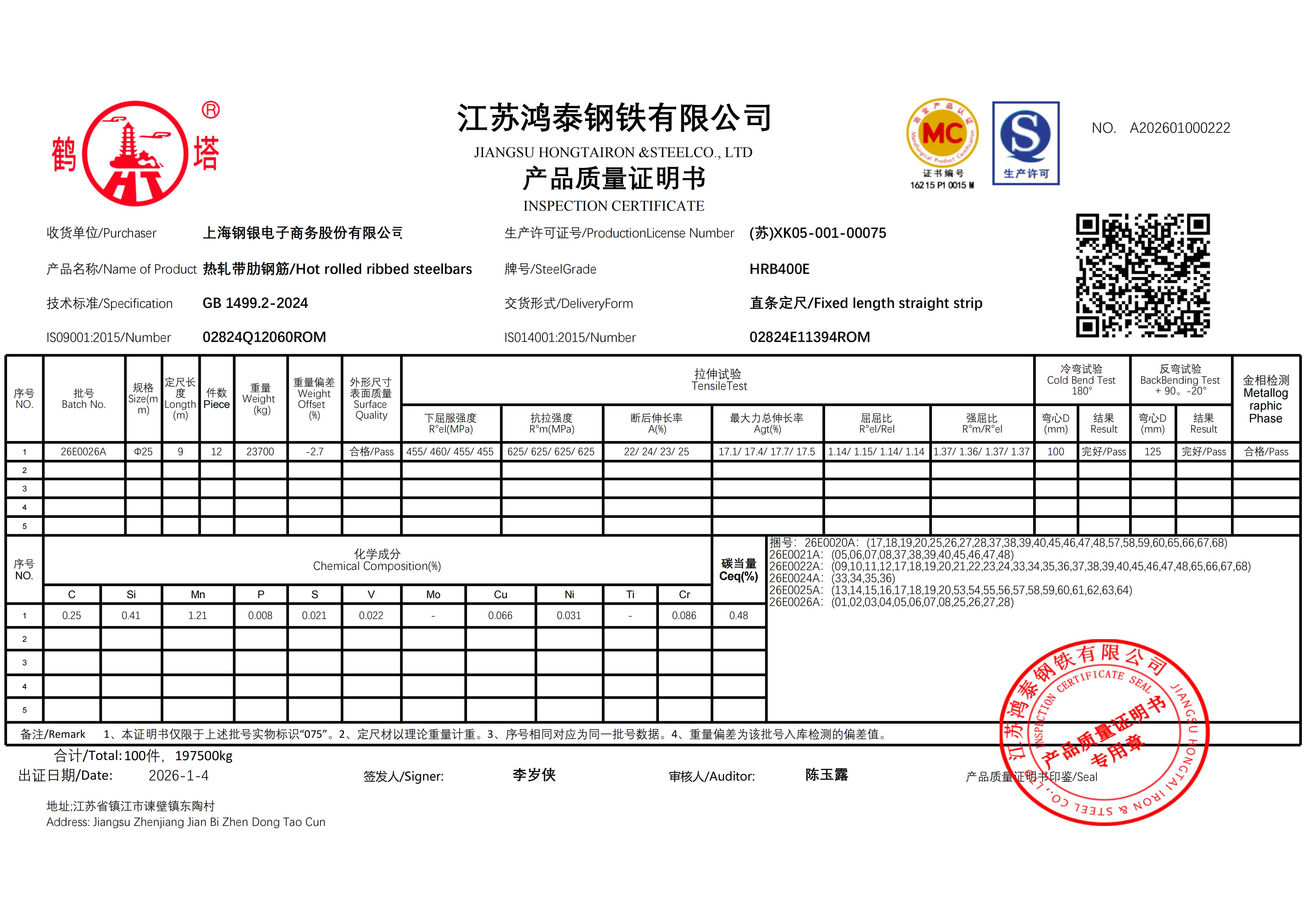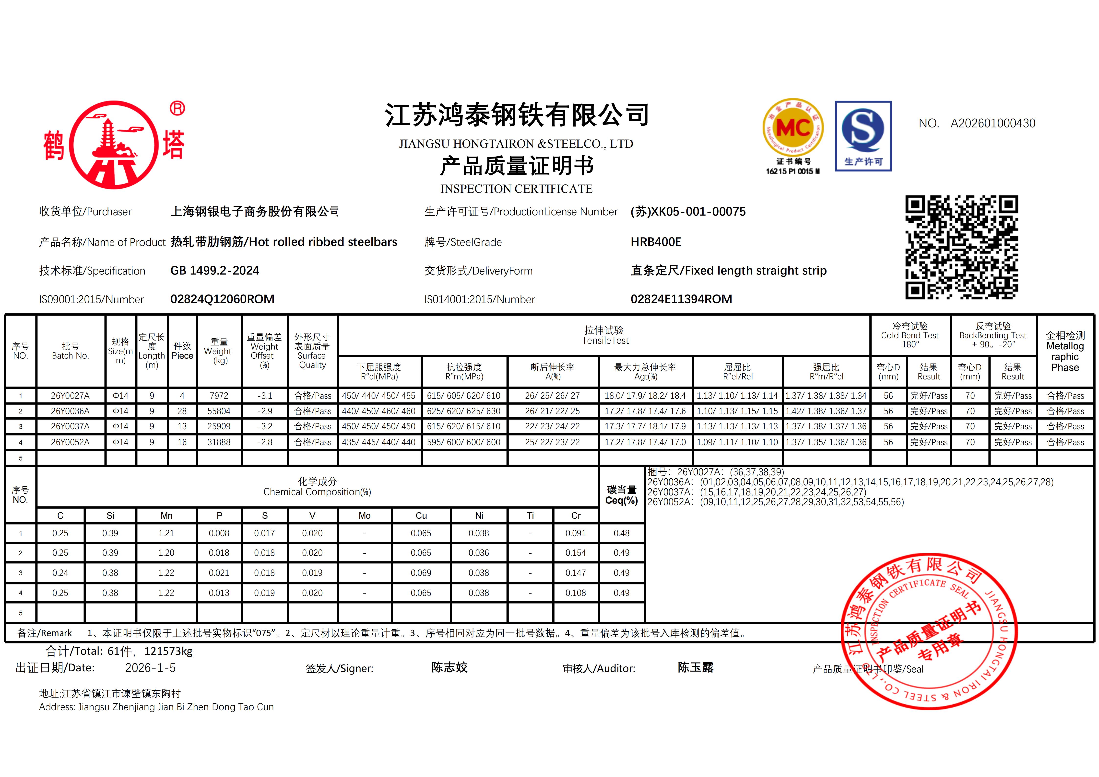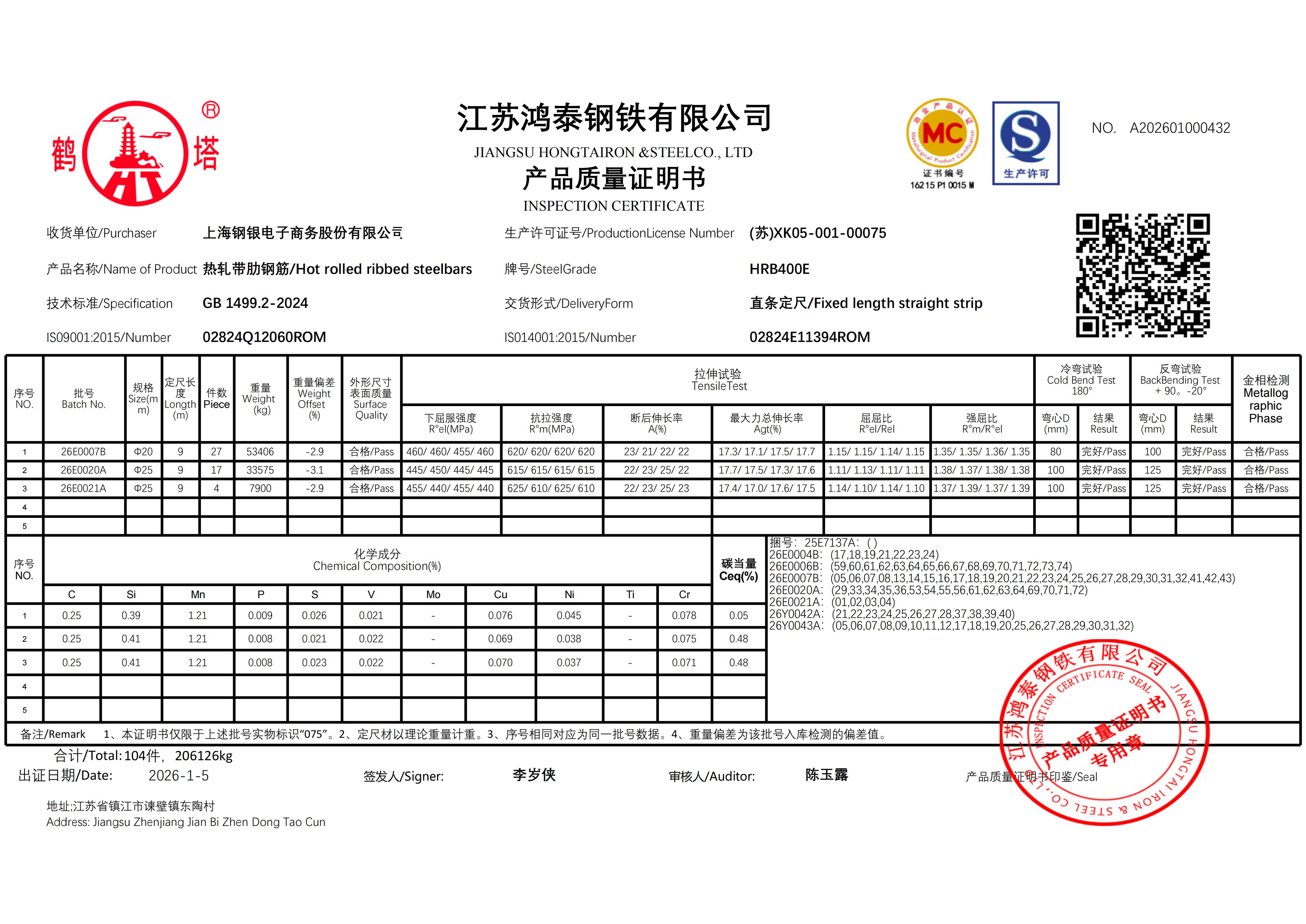 江苏鸿泰钢铁有限公司 A202601001326上海钢银电子商务股份有限公司NO