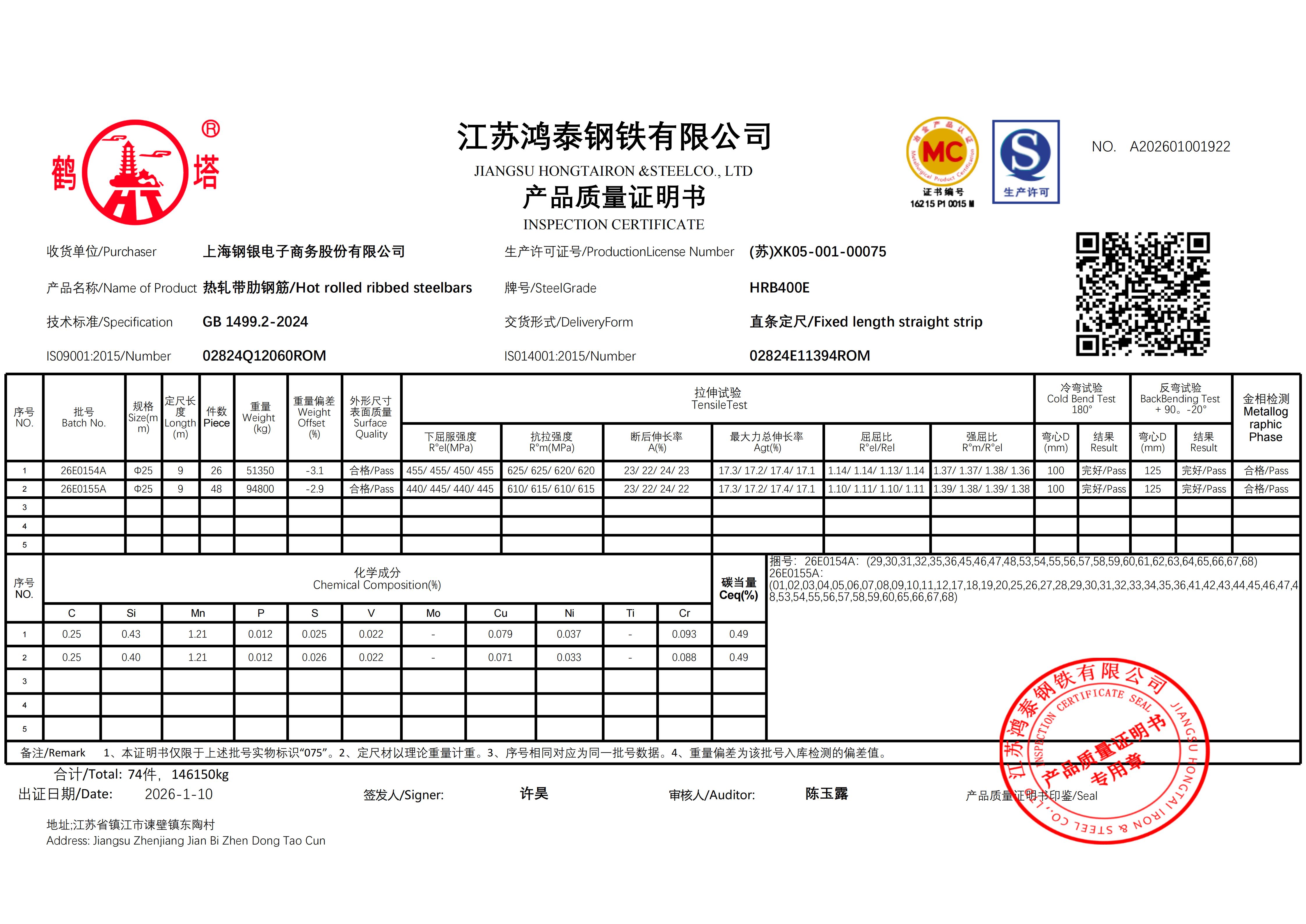 江苏鸿泰钢铁有限公司 A202601001922上海钢银电子商务股份有限公司NO