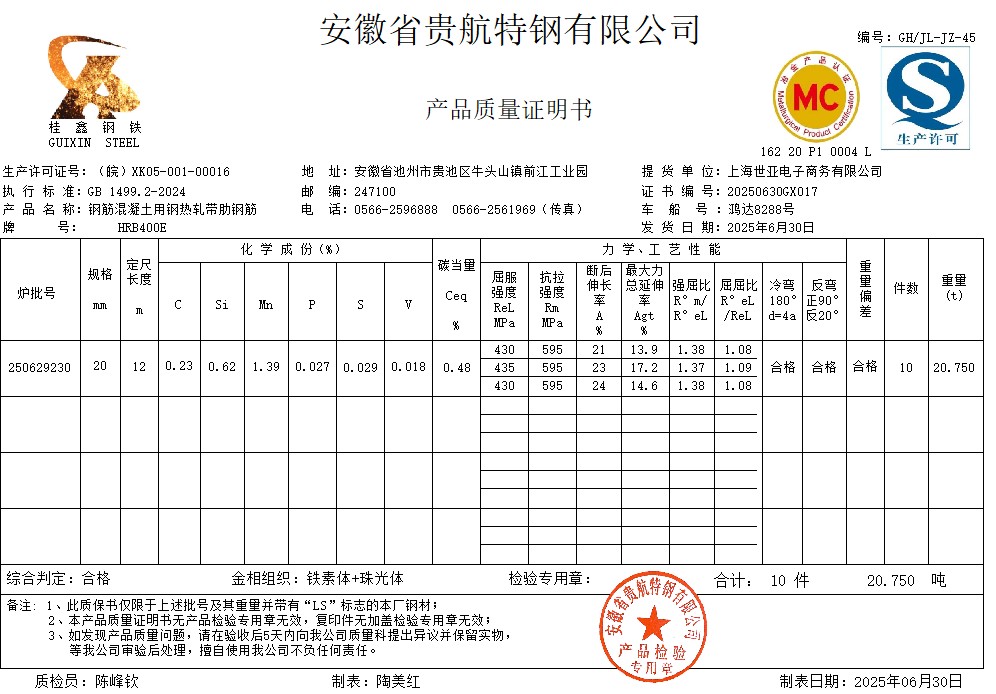 安徽省贵航特钢有限公司GH/JL-JZ-45提货单位:上海世亚电子商务有限公司3、如发现产品质量问题,请在验收后5天内向我公司质量科提出异议并保留实物,等我公司审验后处理,擅自使用我公司不负任何责任。
