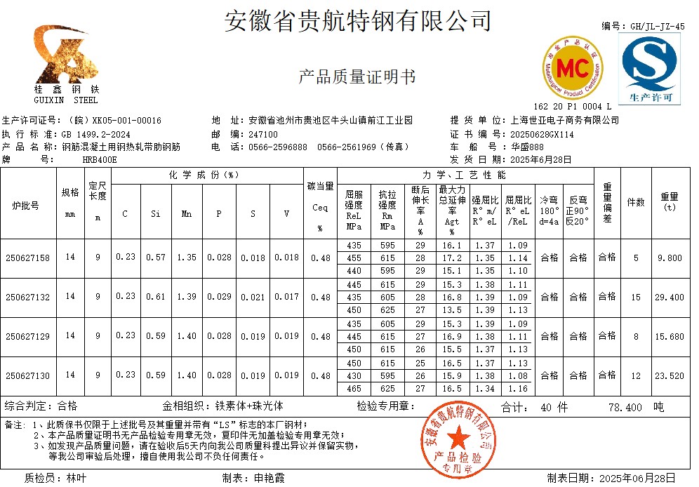 安徽省贵航特钢有限公司GH/JL-JZ-45提货单位:上海世亚电子商务有限公司3、如发现产品质量问题,请在验收后5天内向我公司质量科提出异议并保留实物,等我公司审验后处理,擅自使用我公司不负任何责任。