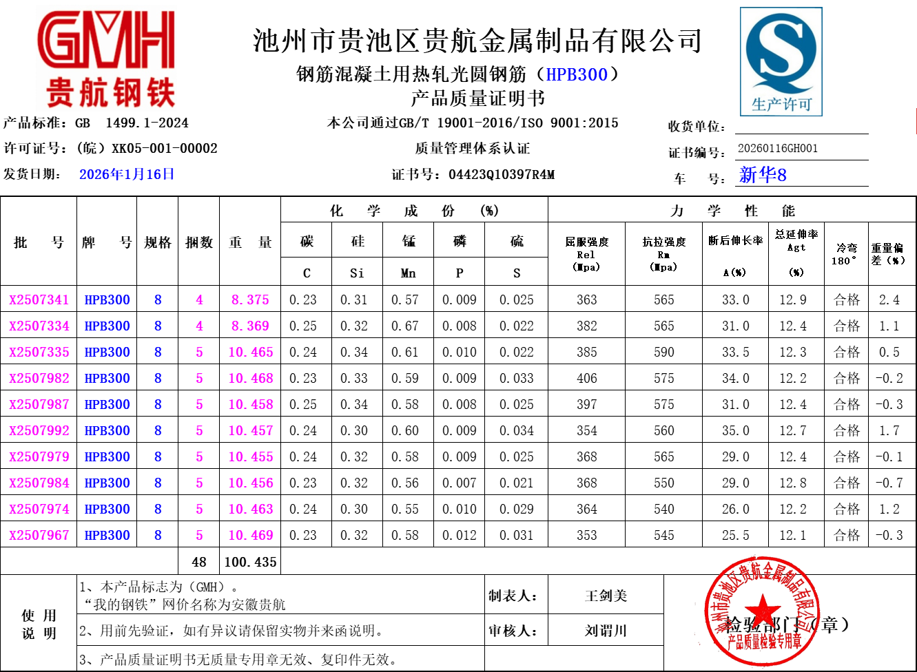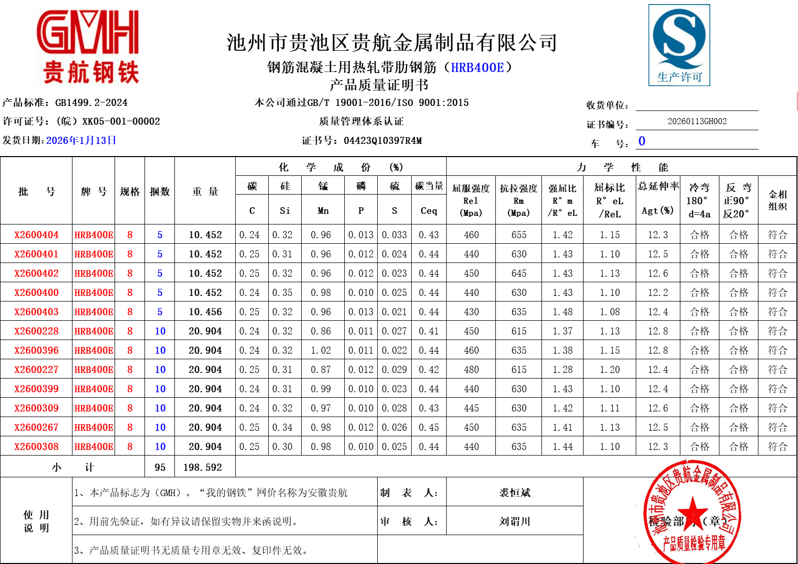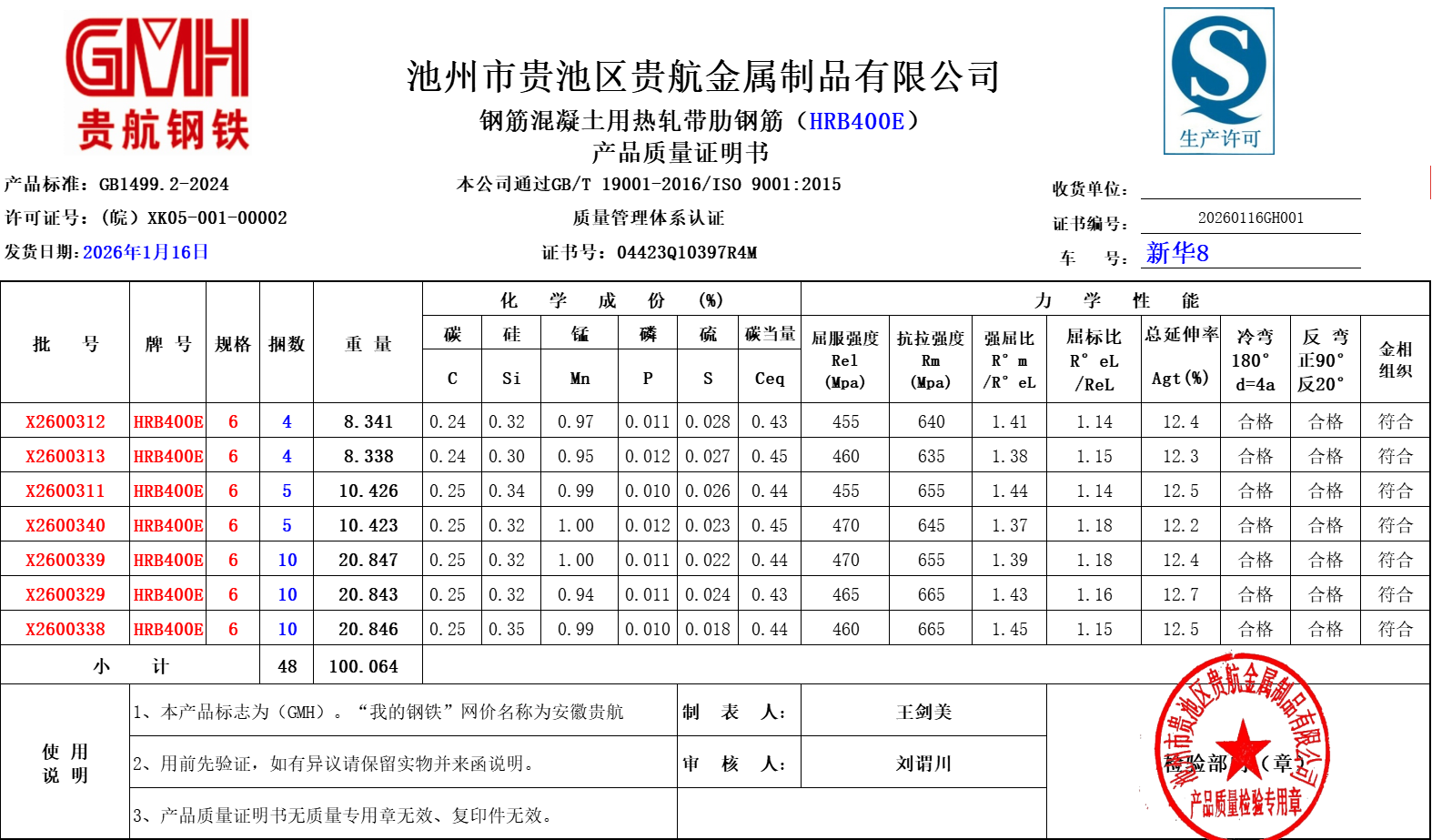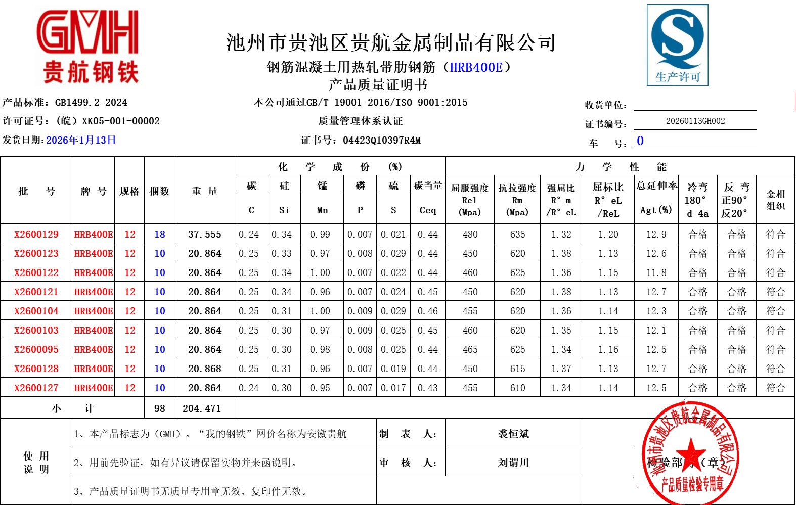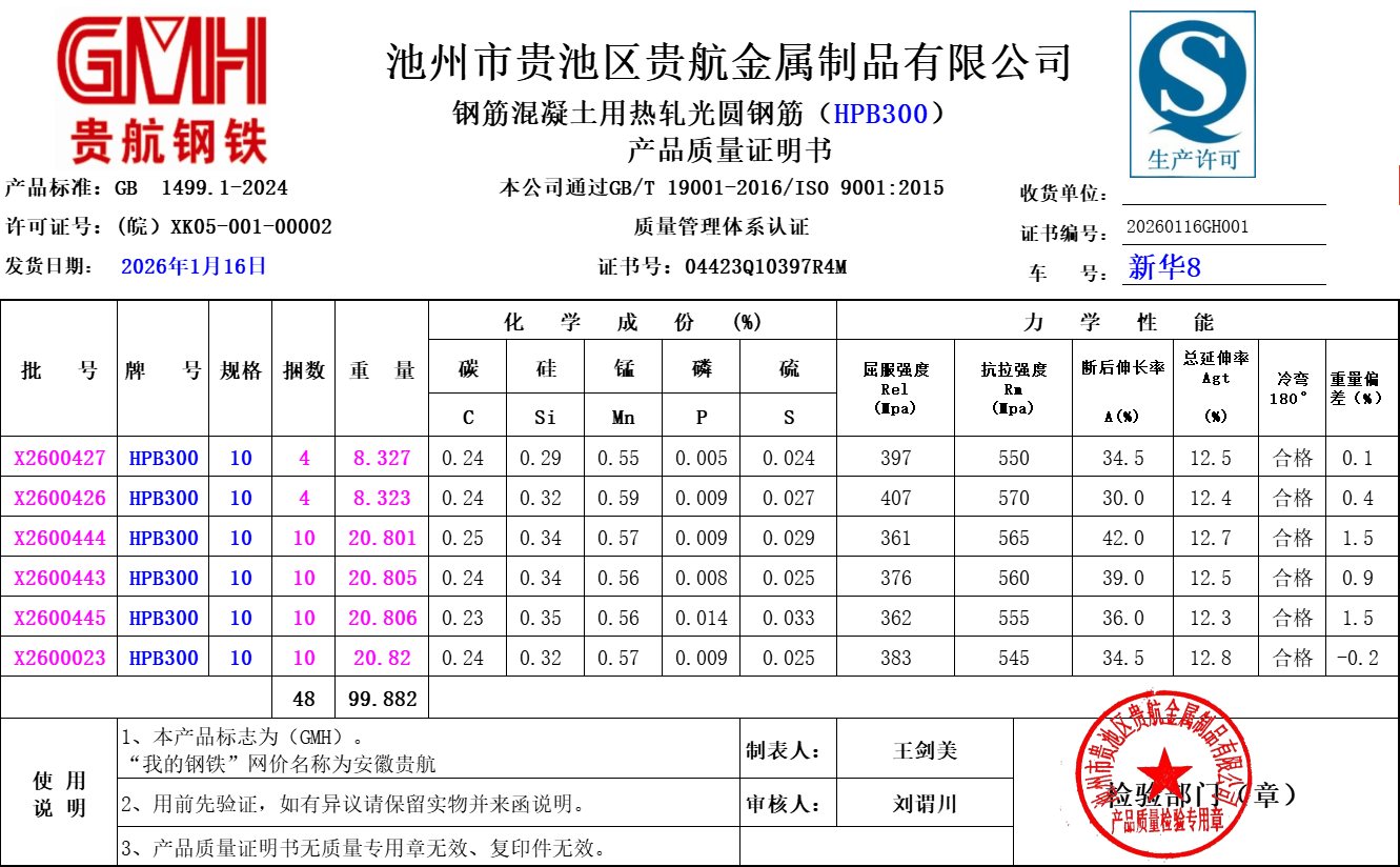 安徽省贵航特钢有限公司GH/JL-JZ-45提货单位:陕西建工材料设备物流集团有限公司3、如发现产品质量问题,请在验收后5天内向我公司质量科提出异议并保留实物,等我公司审验后处理,擅自使用我公司不负任何责任。