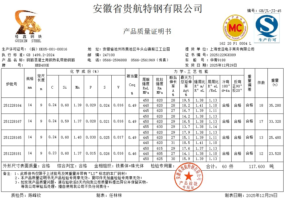 安徽省贵航特钢有限公司GH/JL-JZ-45提货单位:上海世亚电子商务有限公司3、如发现产品质量问题,请在验收后5天内向我公司质量科提出异议并保留实物,等我公司审验后处理,擅自使用我公司不负任何责任。