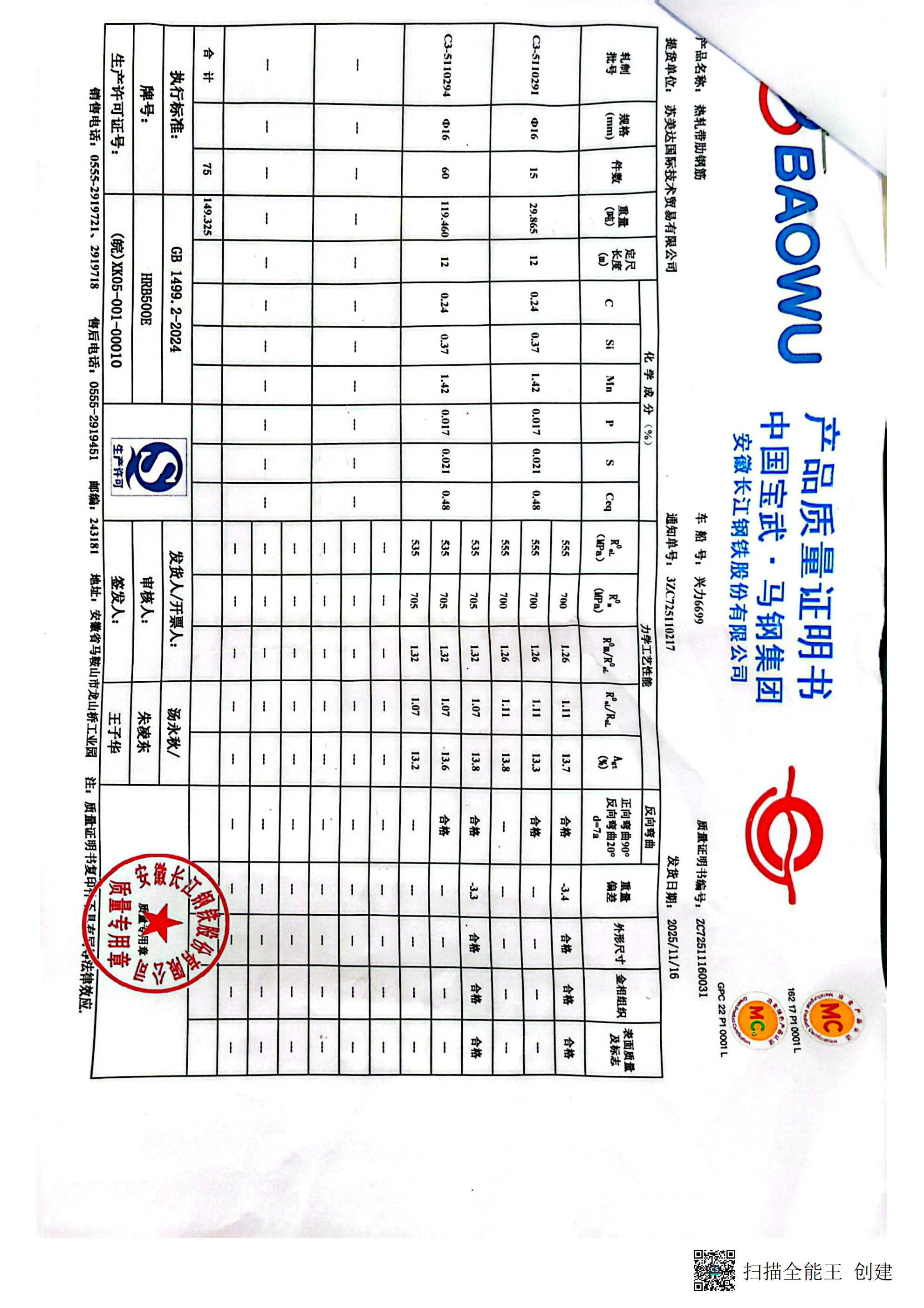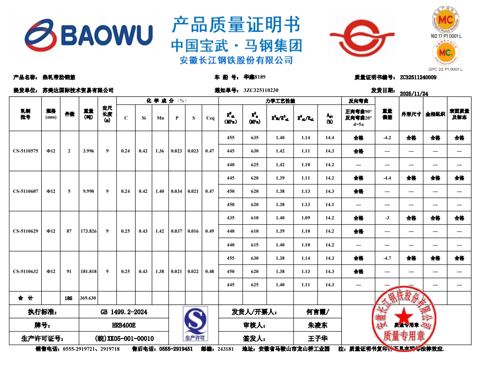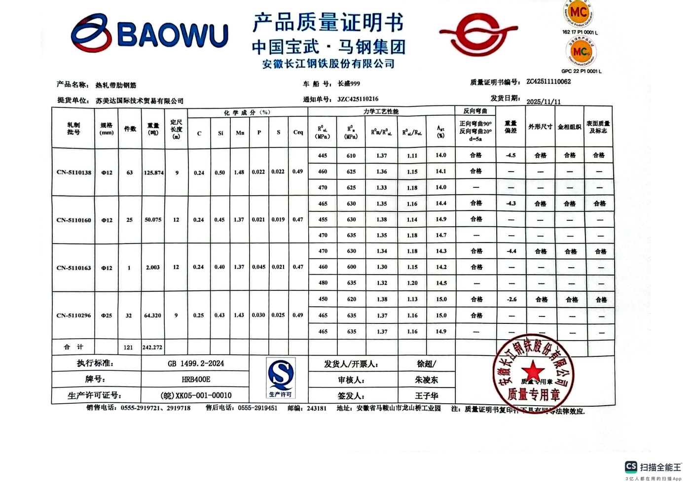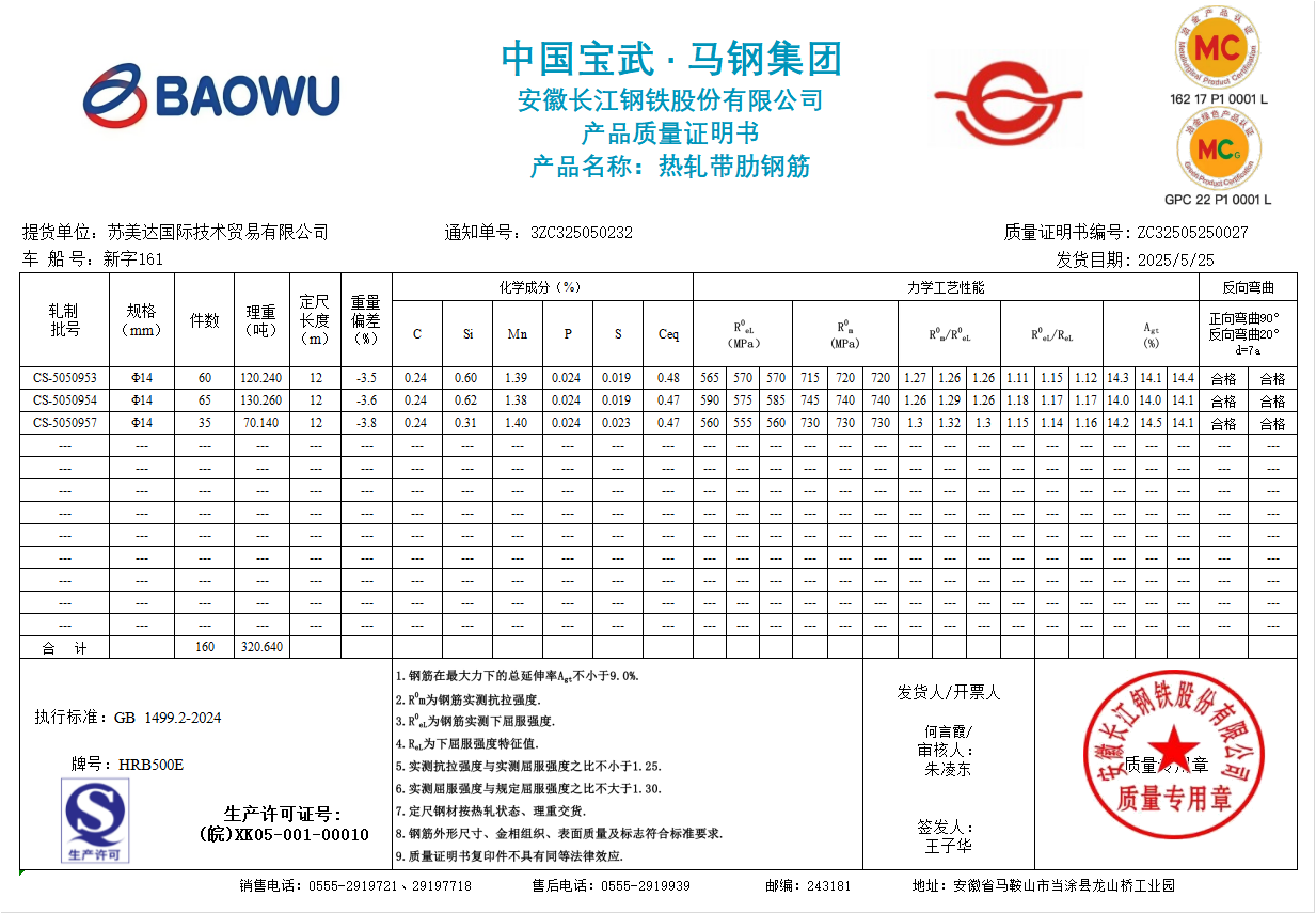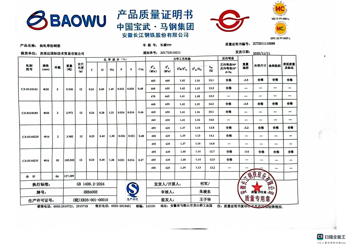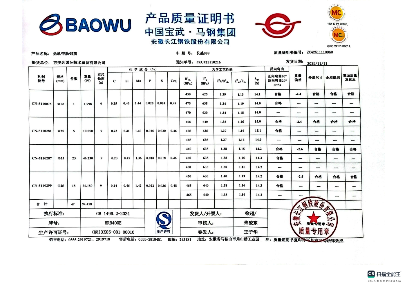 安徽长江钢铁股份有限公司提货单位:苏美达国际技术贸易有限公司
