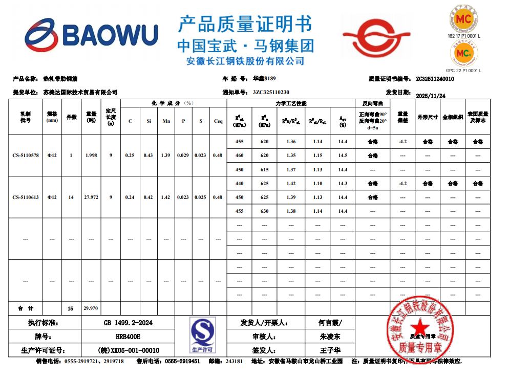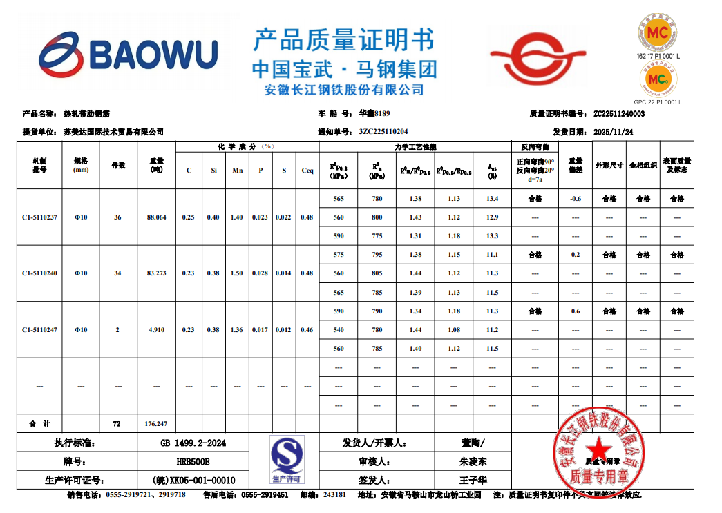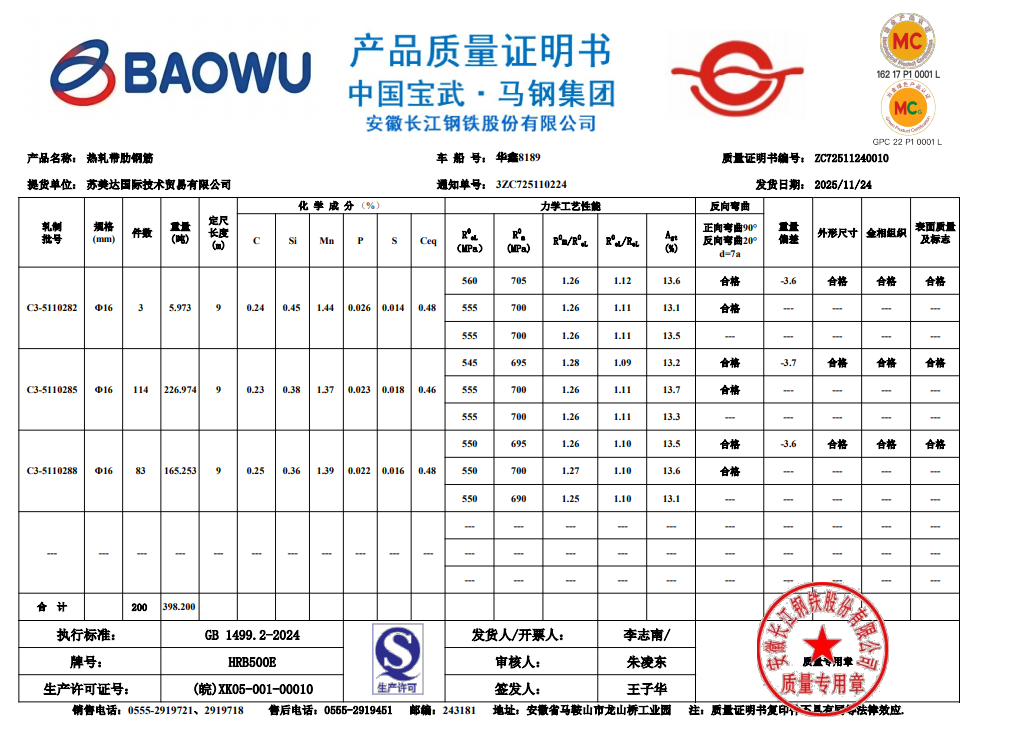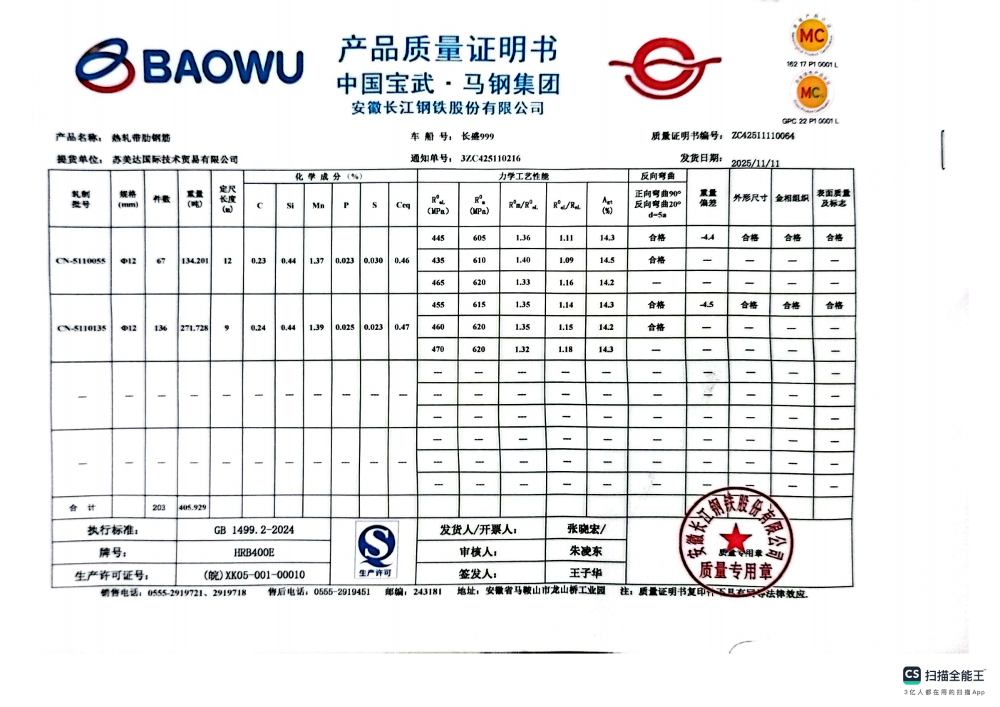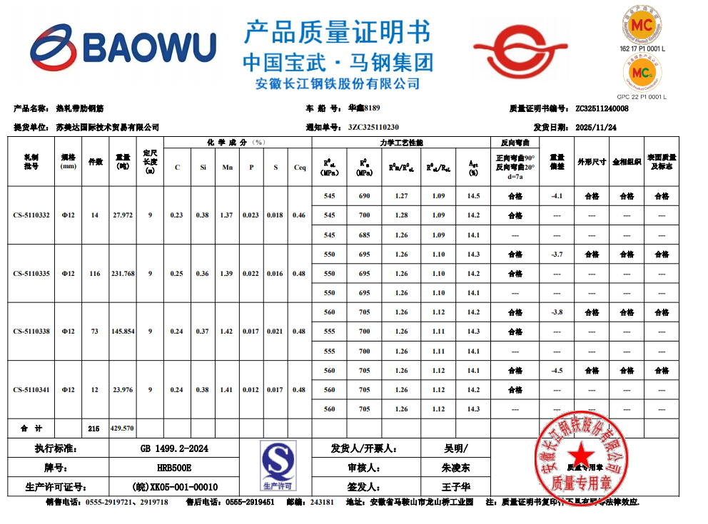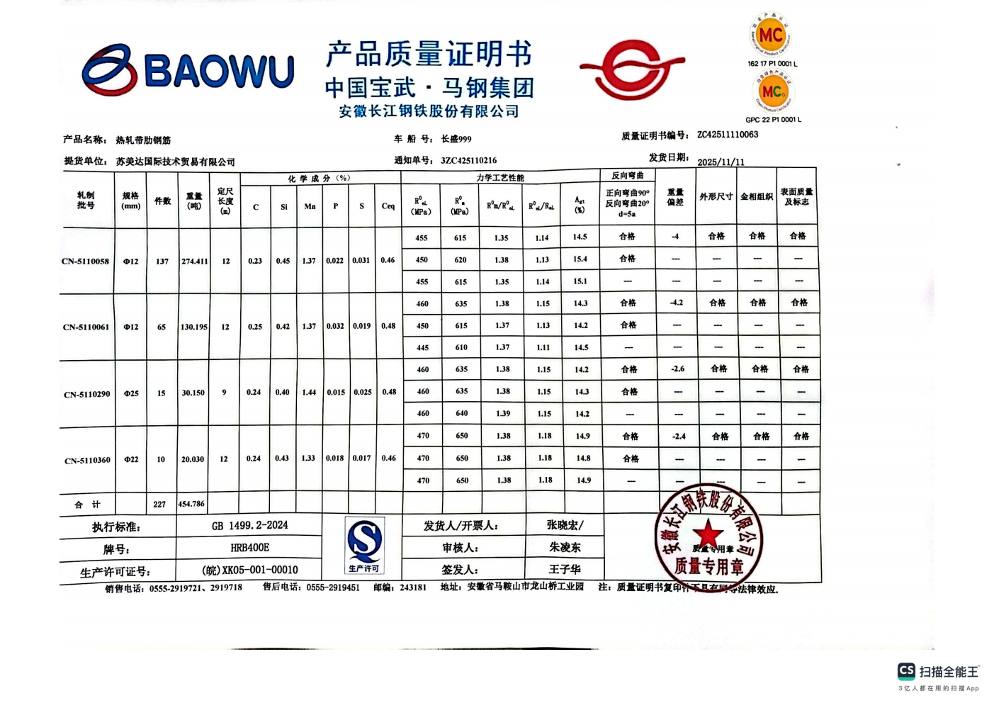 安徽长江钢铁股份有限公司提货单位:苏美达国际技术贸易有限公司