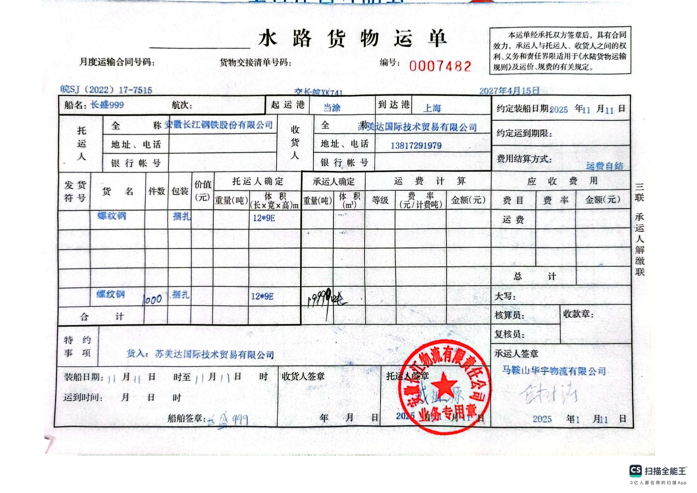 安徽长江钢铁股份有限公司苏美达国际技术贸易有限公司货入:苏美达国际技术贸易有限公司马鞍山华宇物流有限公司