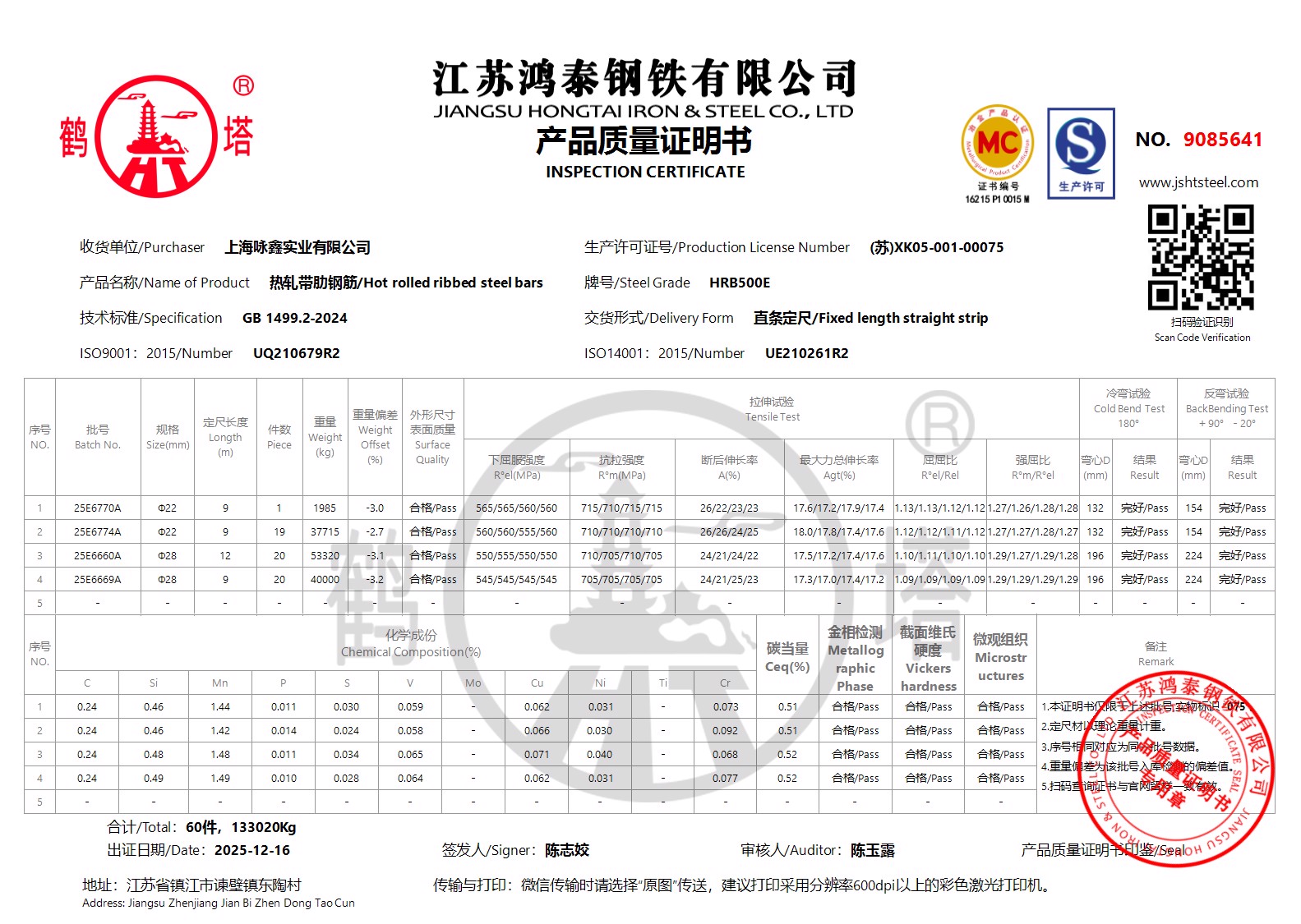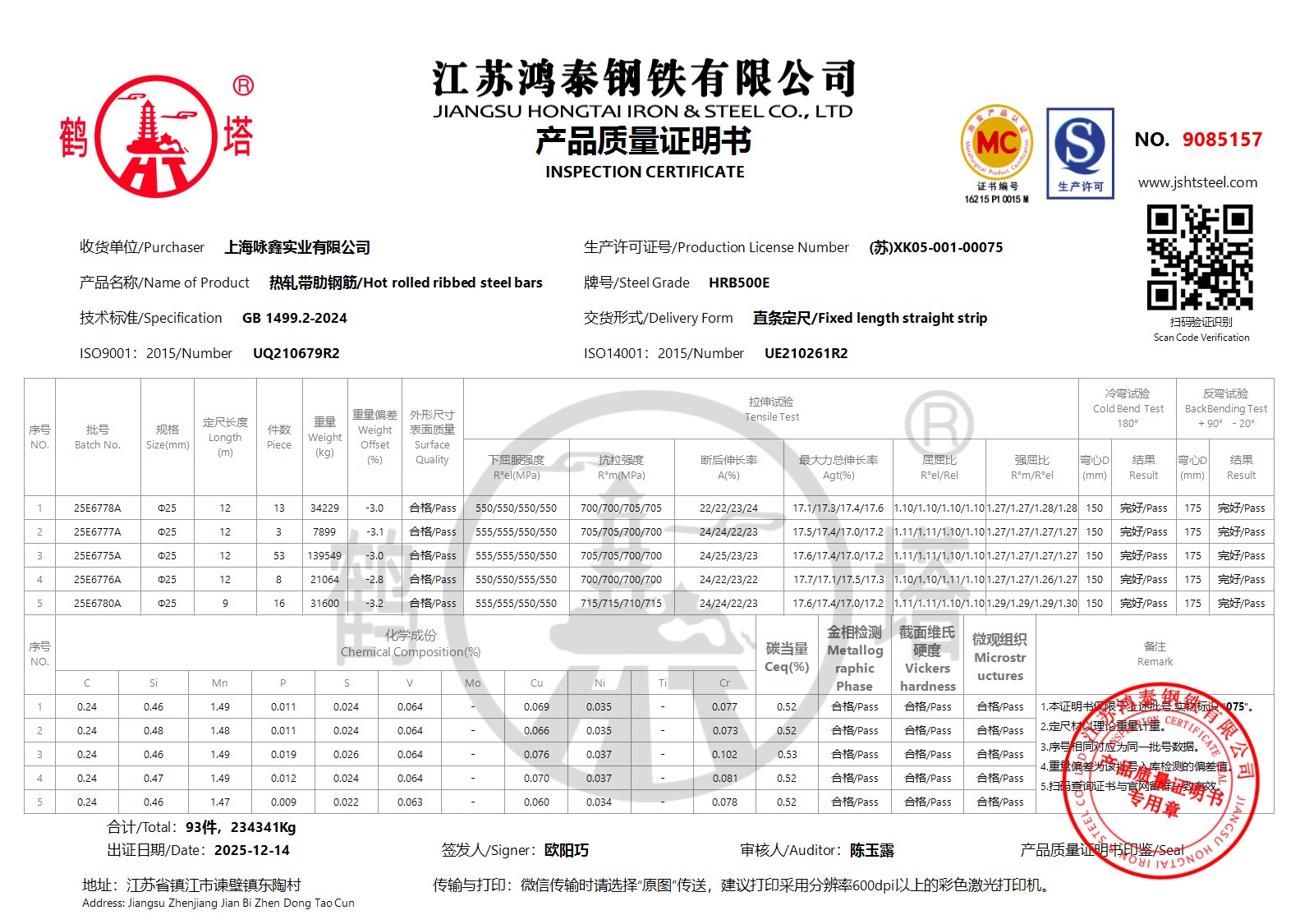 江苏鸿泰钢铁有限公司9085640上海咏鑫实业有限公司