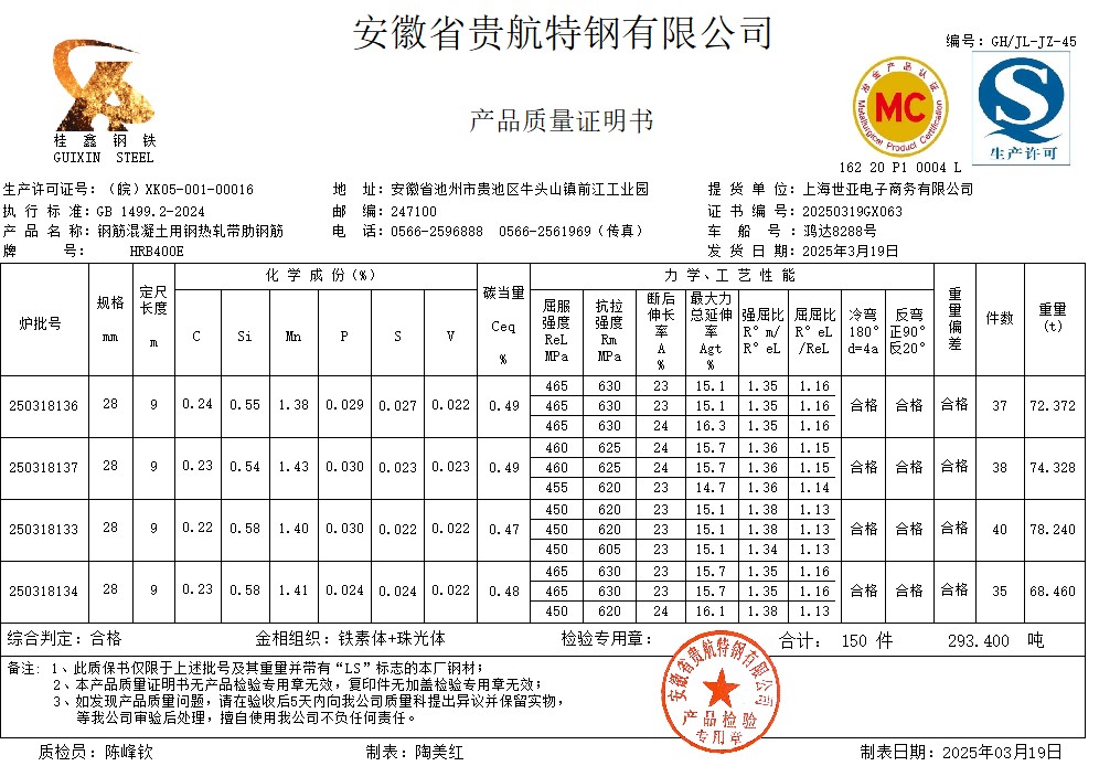 安徽省贵航特钢有限公司GH/JL-JZ-45提货单位:上海世亚电子商务有限公司3、如发现产品质量问题,请在验收后5天内向我公司质量科提出异议并保留实物,等我公司审验后处理,擅自使用我公司不负任何责任。