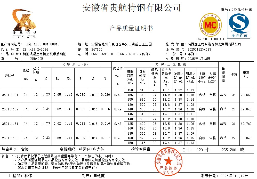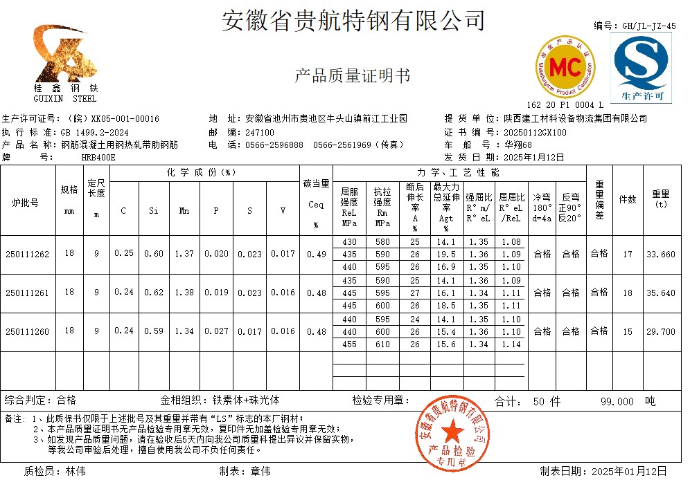 安徽省贵航特钢有限公司GH/JL-JZ-45提货单位:陕西建工材料设备物流集团有限公司3、如发现产品质量问题,请在验收后5天内向我公司质量科提出异议并保留实物,等我公司审验后处理,擅自使用我公司不负任何责任。