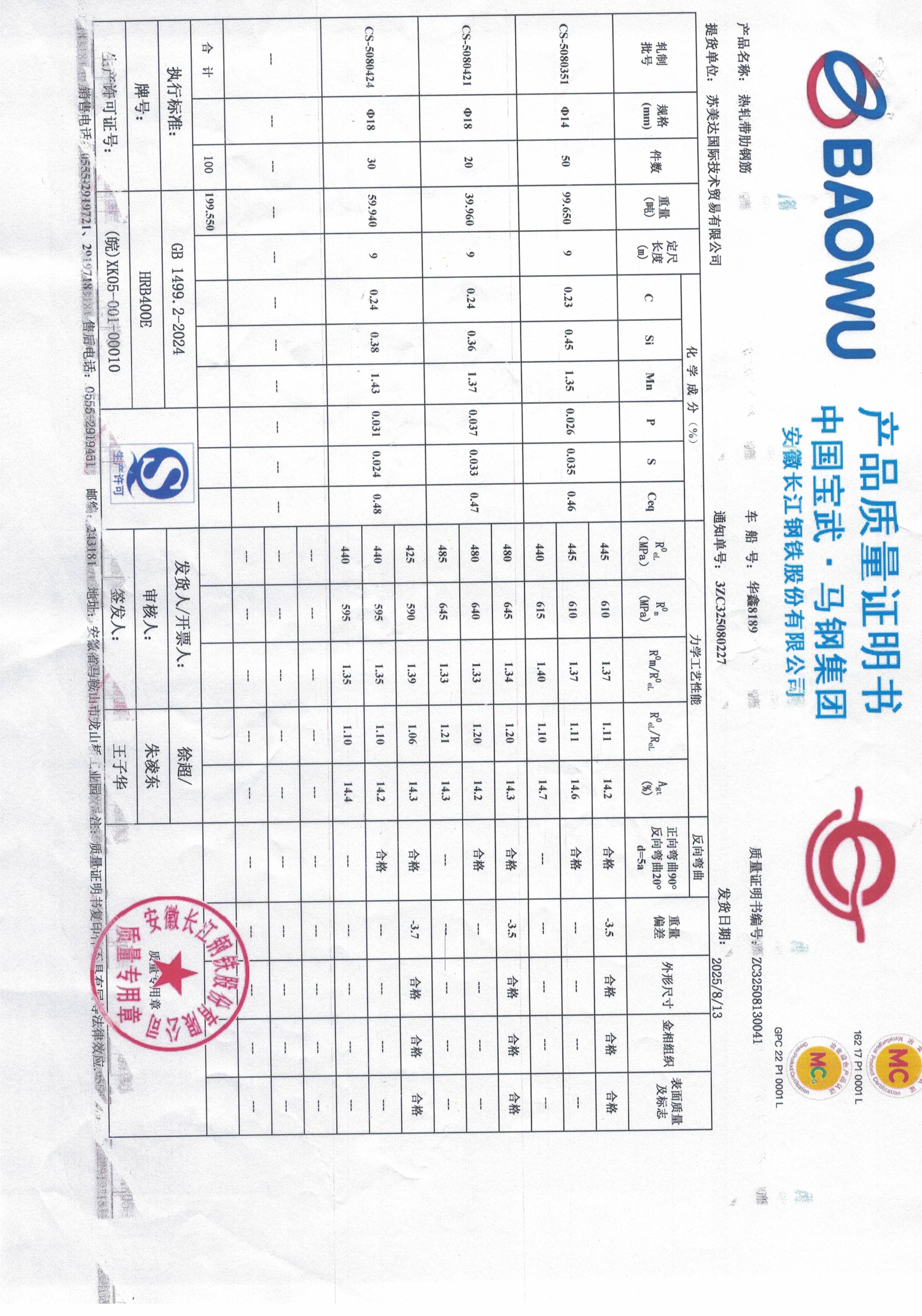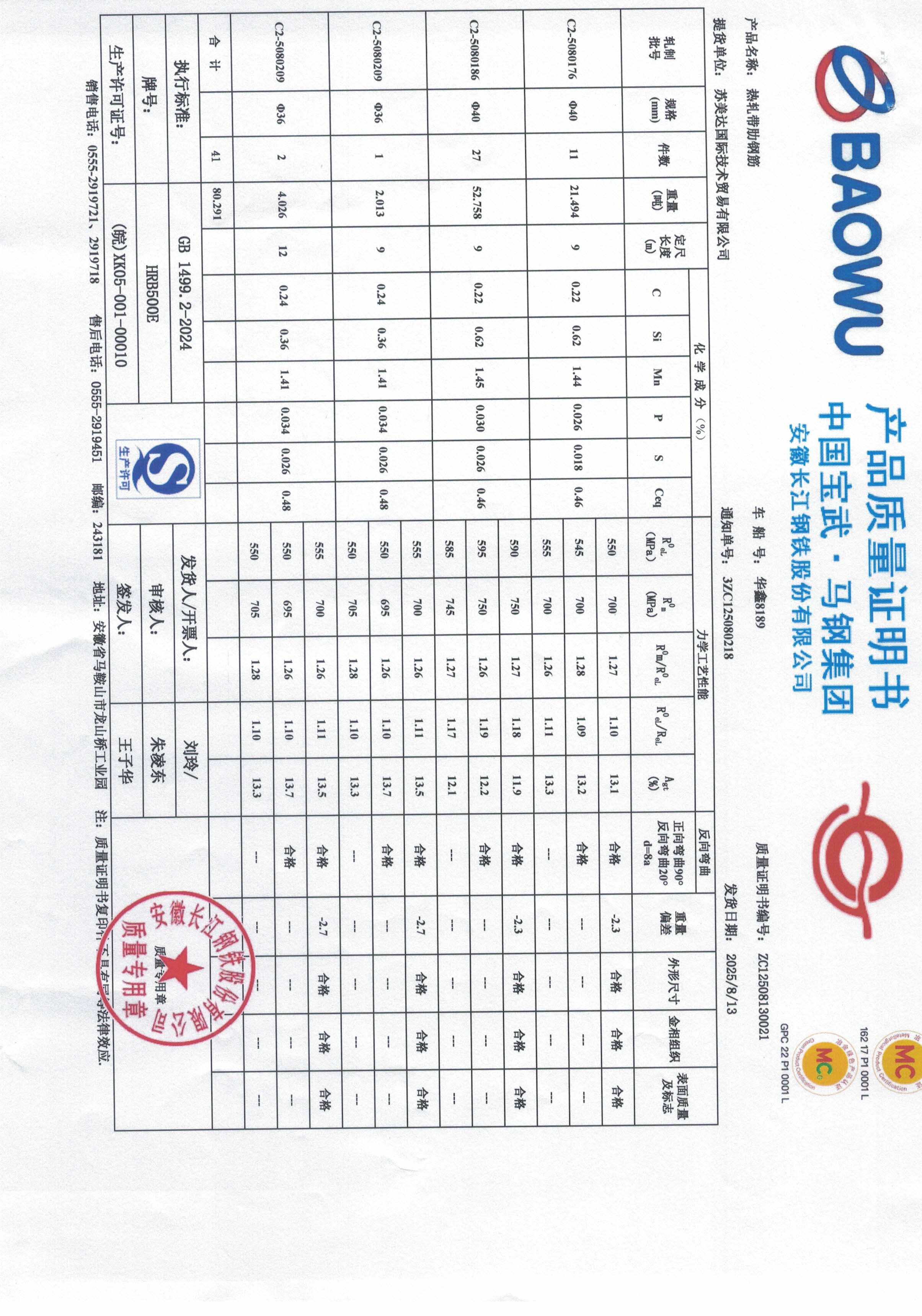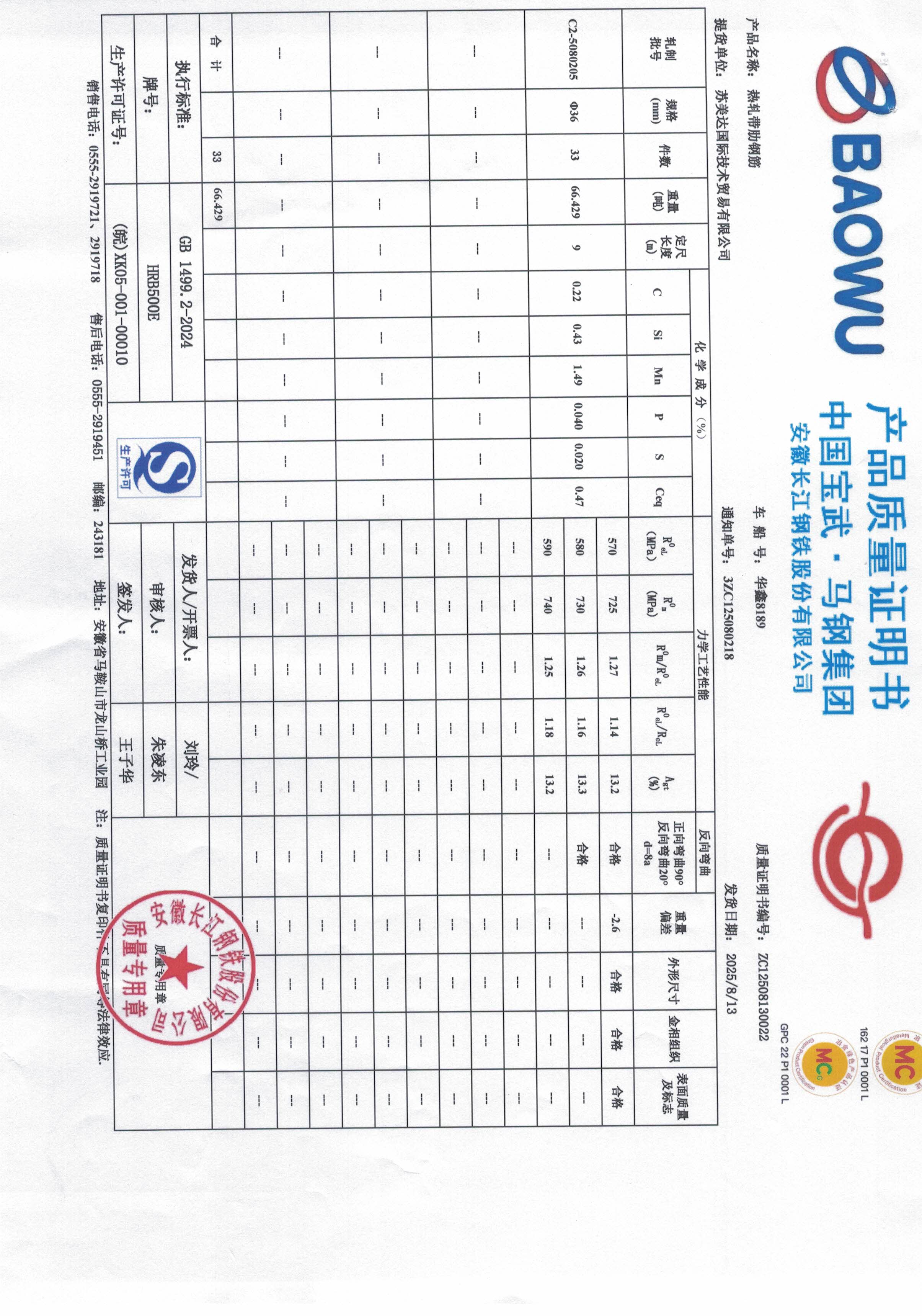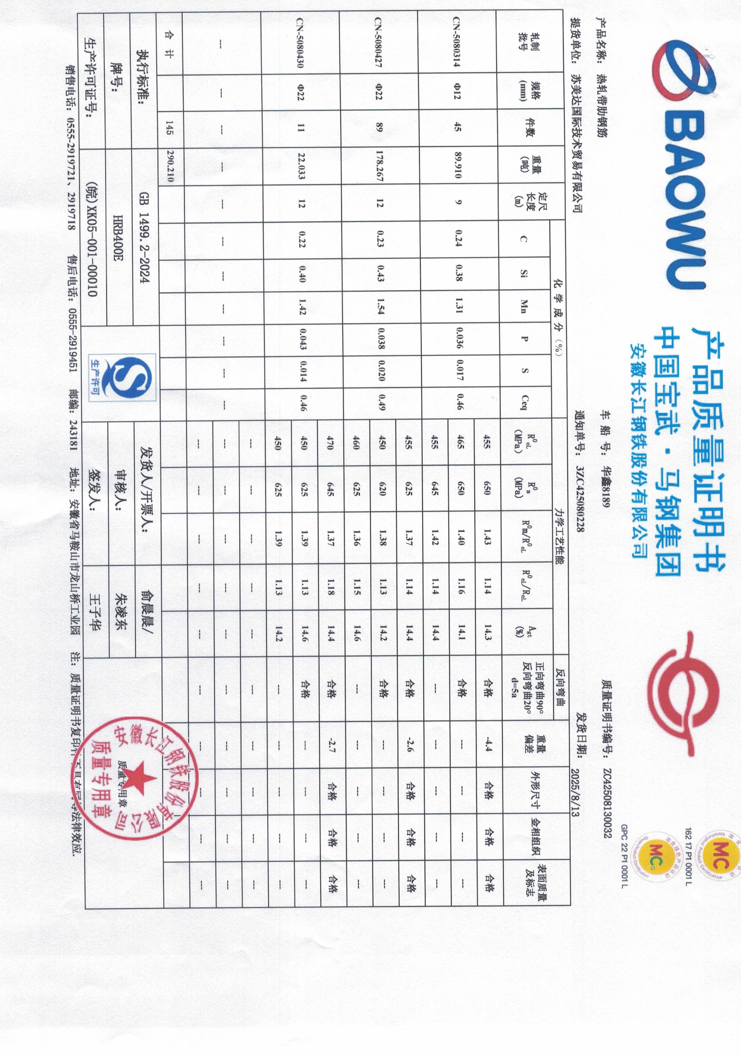 安徽长江钢铁股份有限公司提货单位:苏美达国际技术贸易有限公司