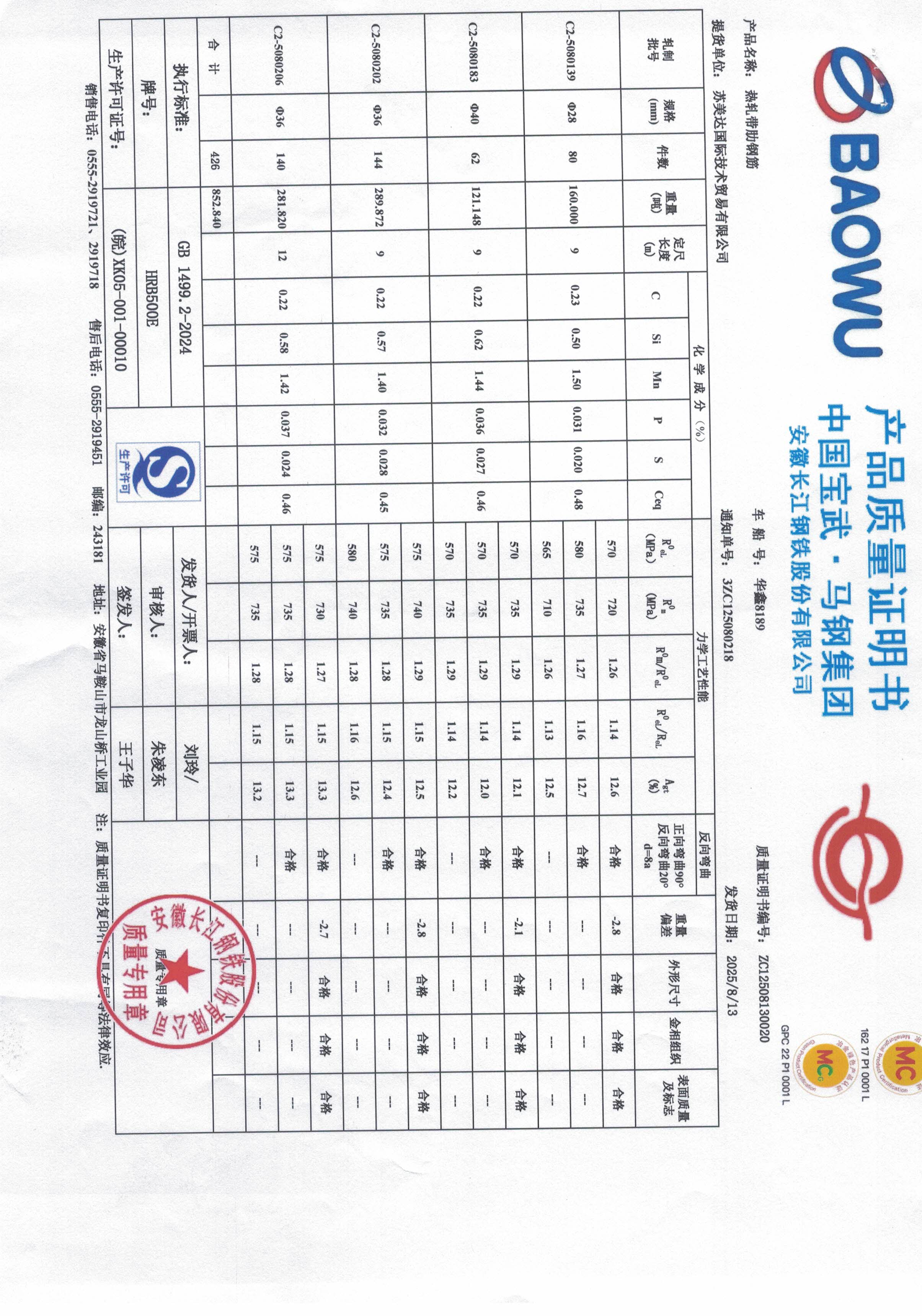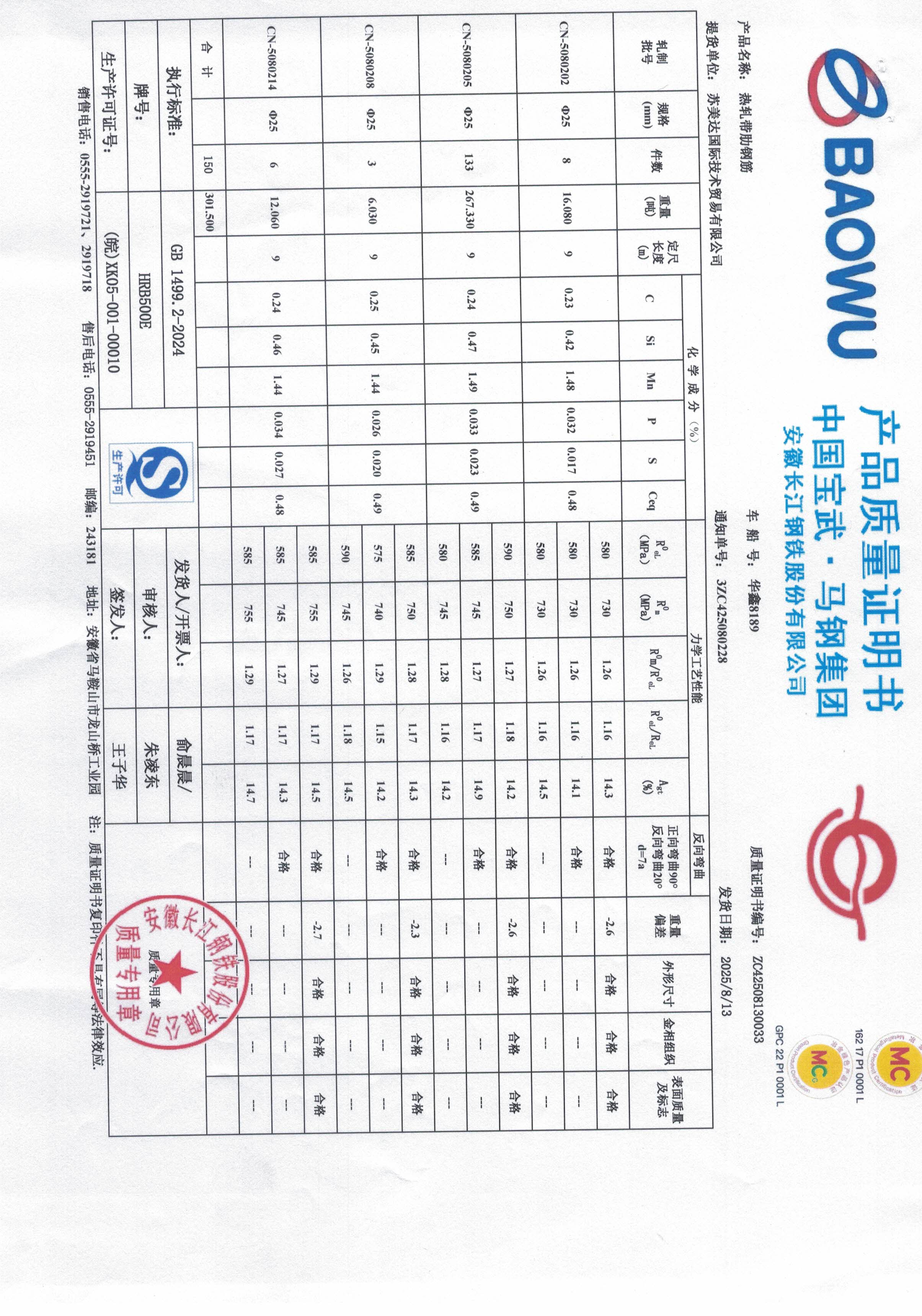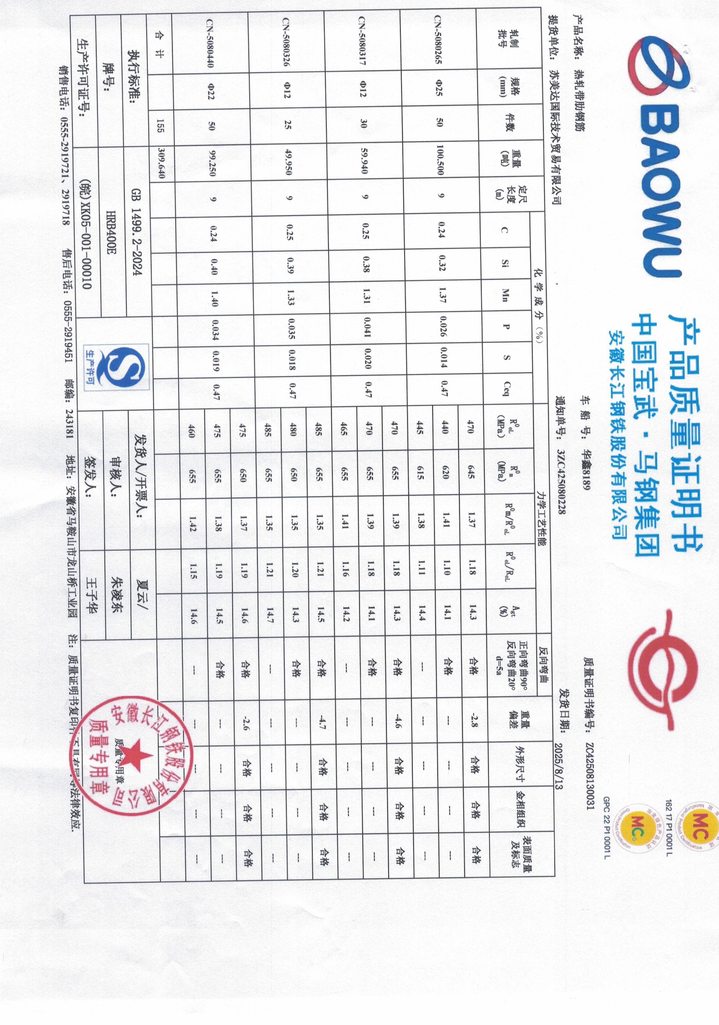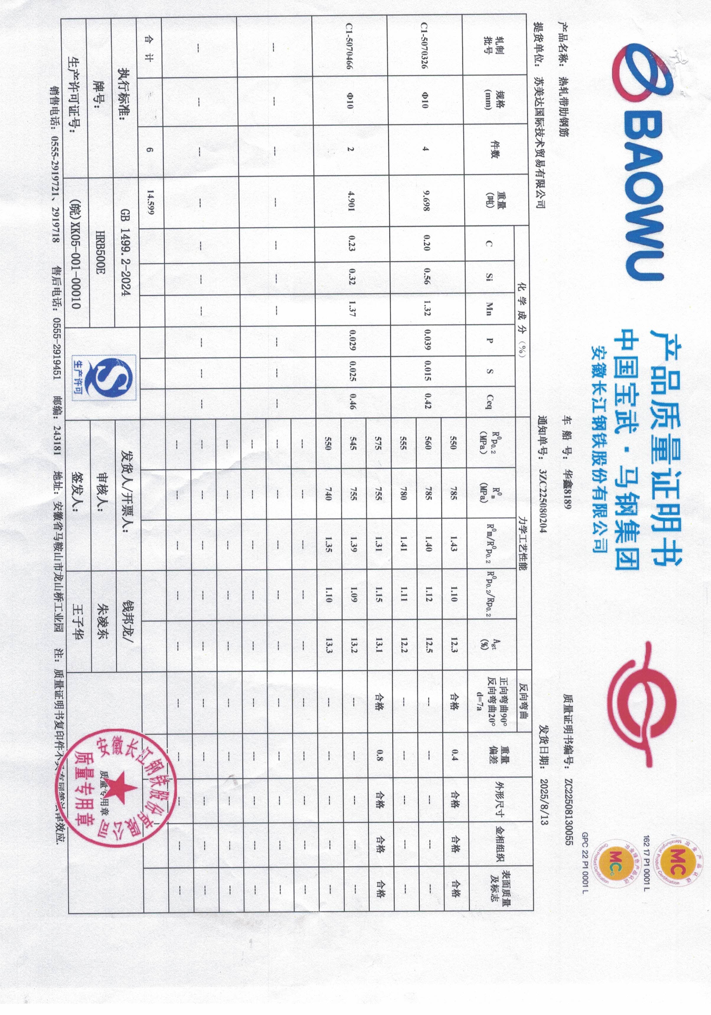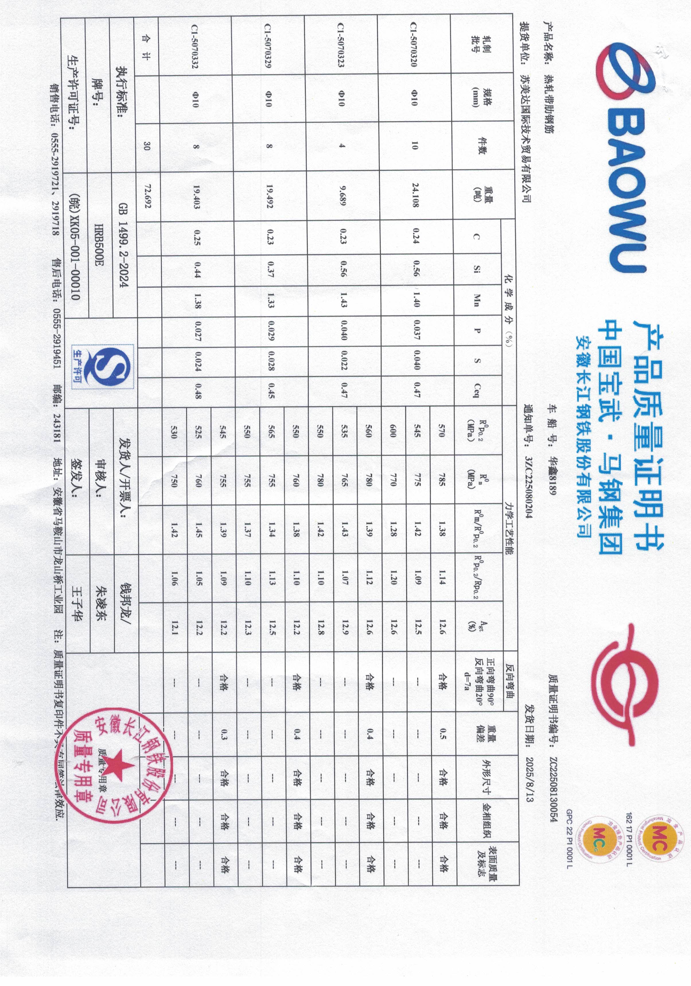 安徽长江钢铁股份有限公司提货单位:苏美达国际技术贸易有限公司