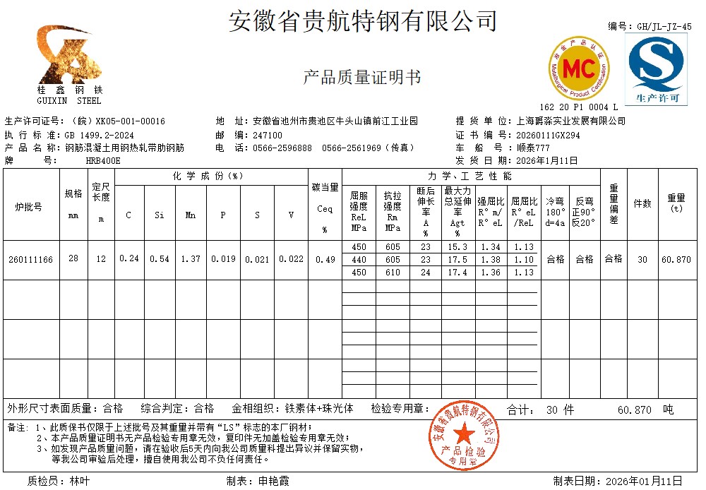安徽省贵航特钢有限公司GH/JL-JZ-45提货单位:上海钢银电子商务股份有限公司3、如发现产品质量问题,请在验收后5天内向我公司质量科提出异议并保留实物,等我公司审验后处理,擅自使用我公司不负任何责任。