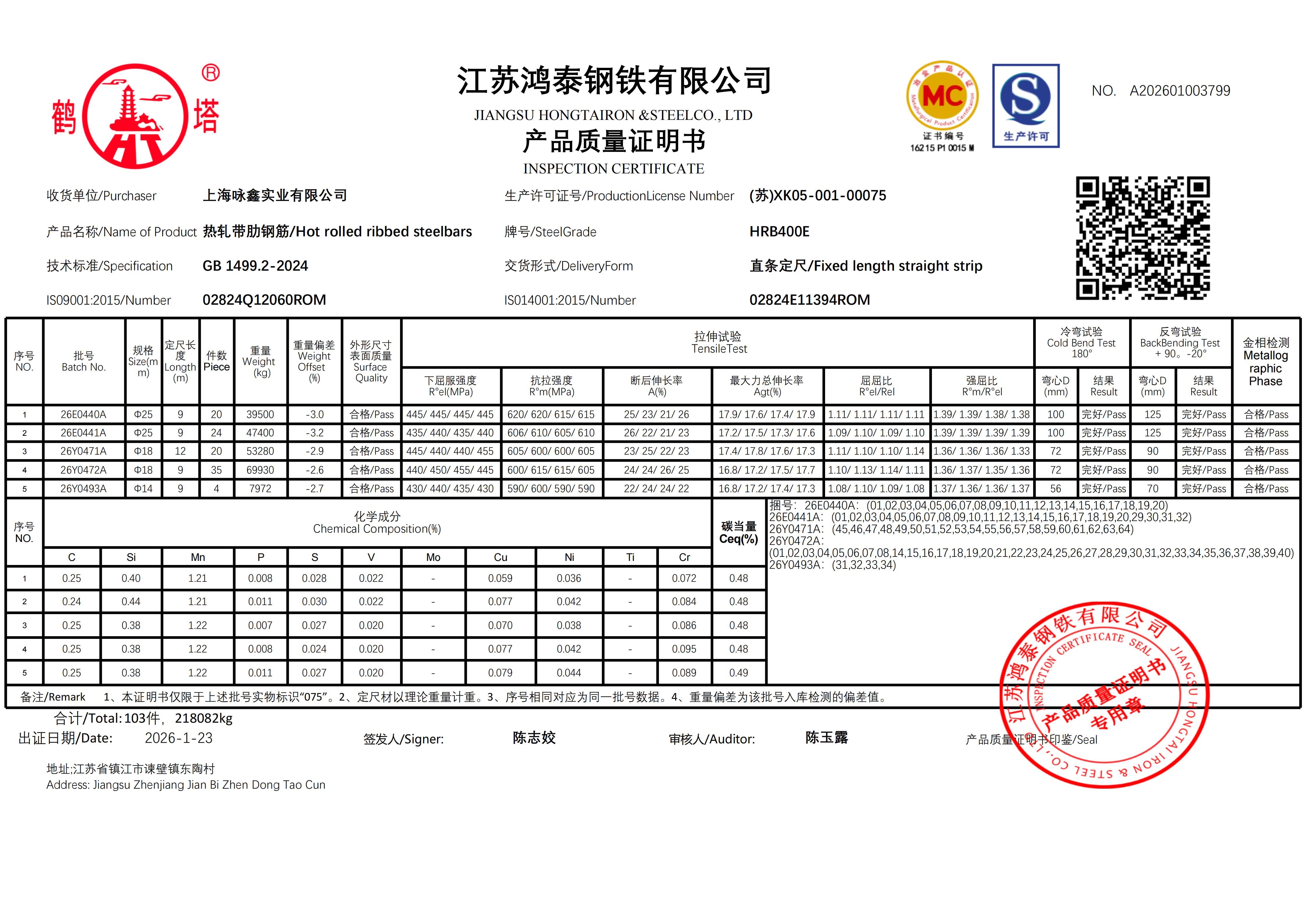江苏鸿泰钢铁有限公司 A202601003798上海咏鑫实业有限公司NOHIIVIONO