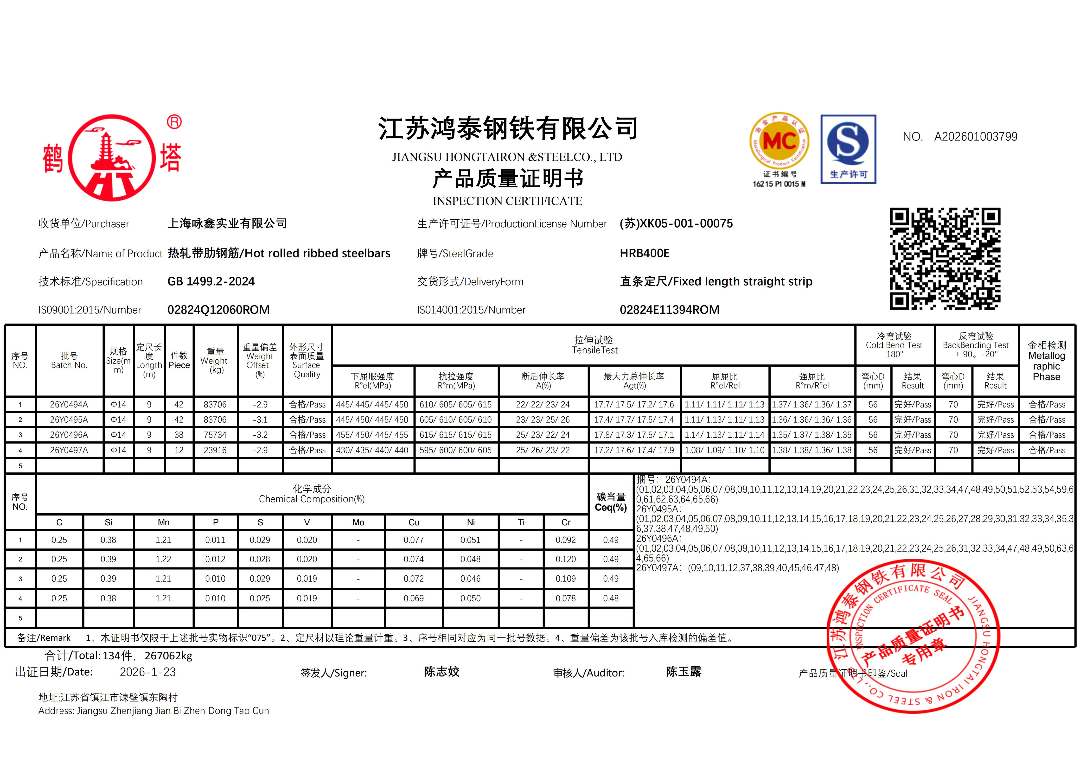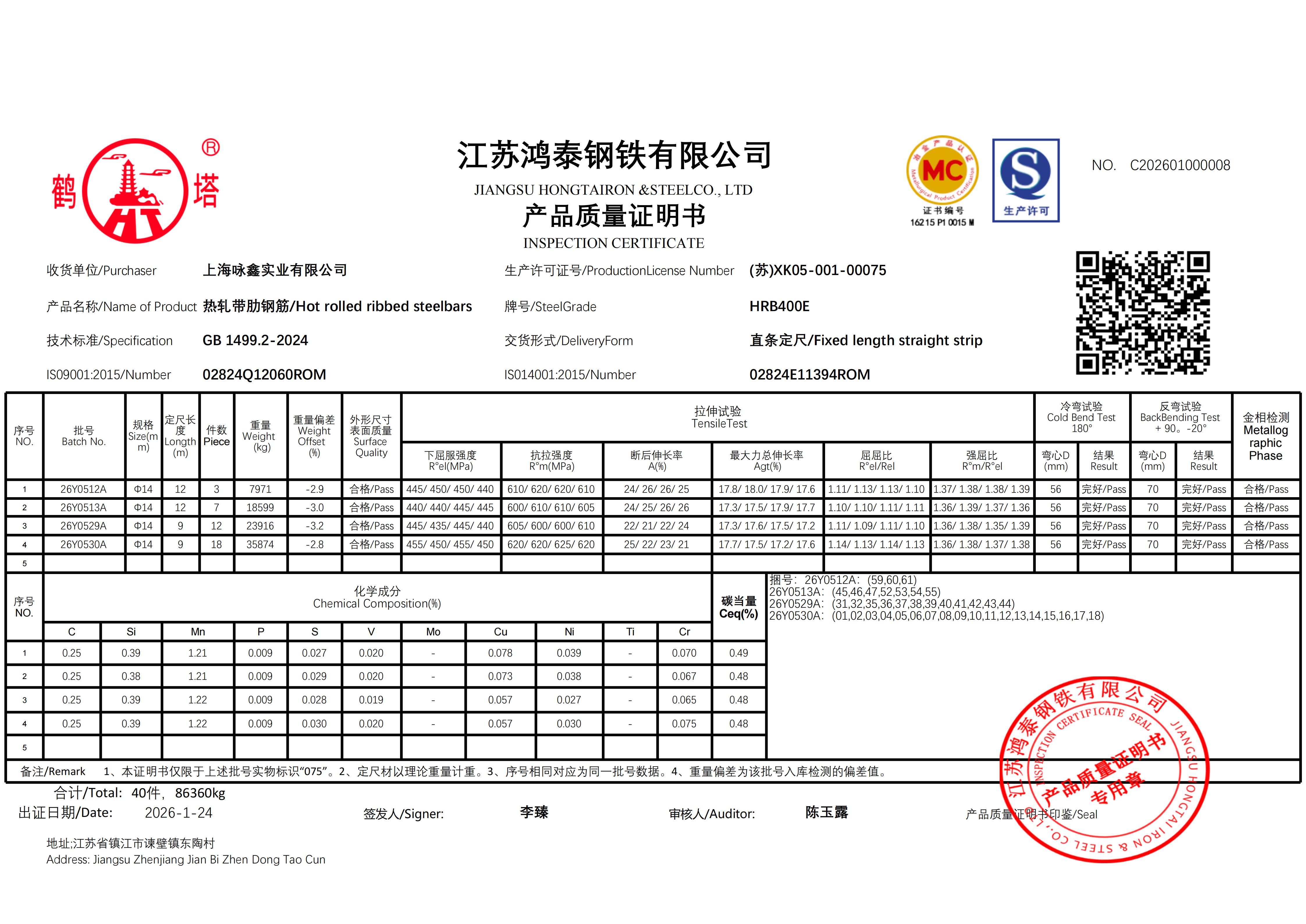 江苏鸿泰钢铁有限公司 C202601000018上海咏鑫实业有限公司NONO