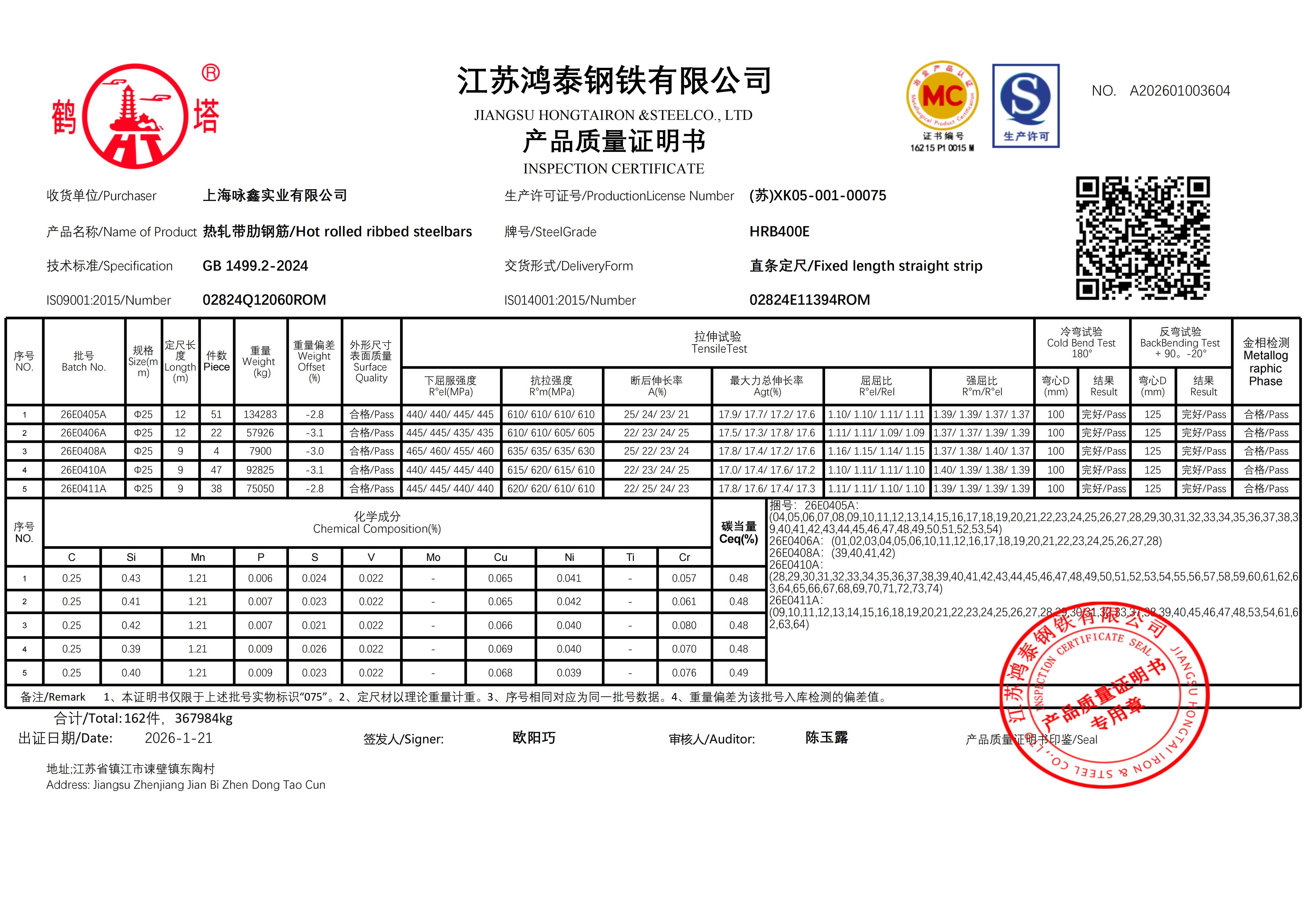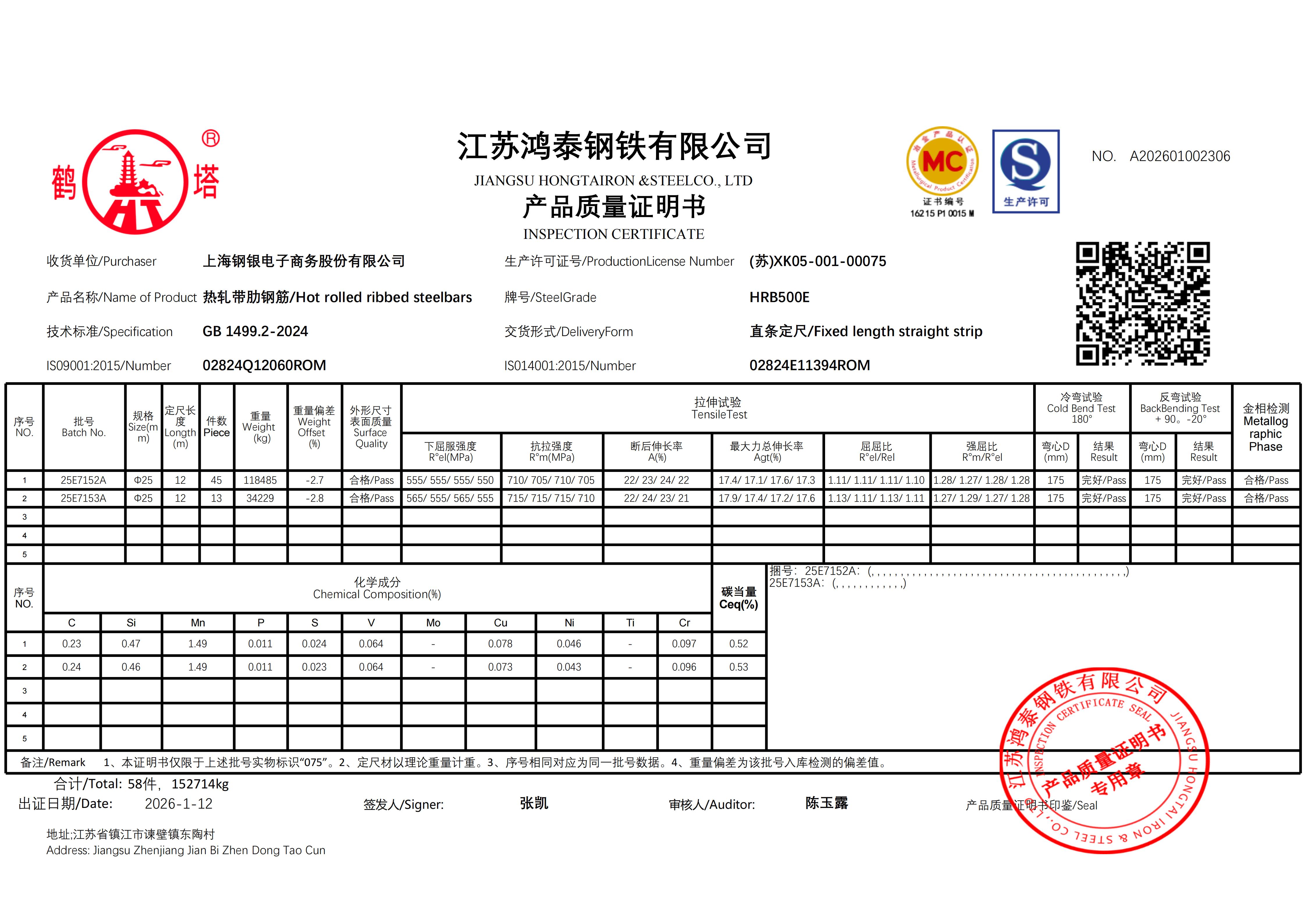 江苏鸿泰钢铁有限公司 A202601003604上海咏鑫实业有限公司NO