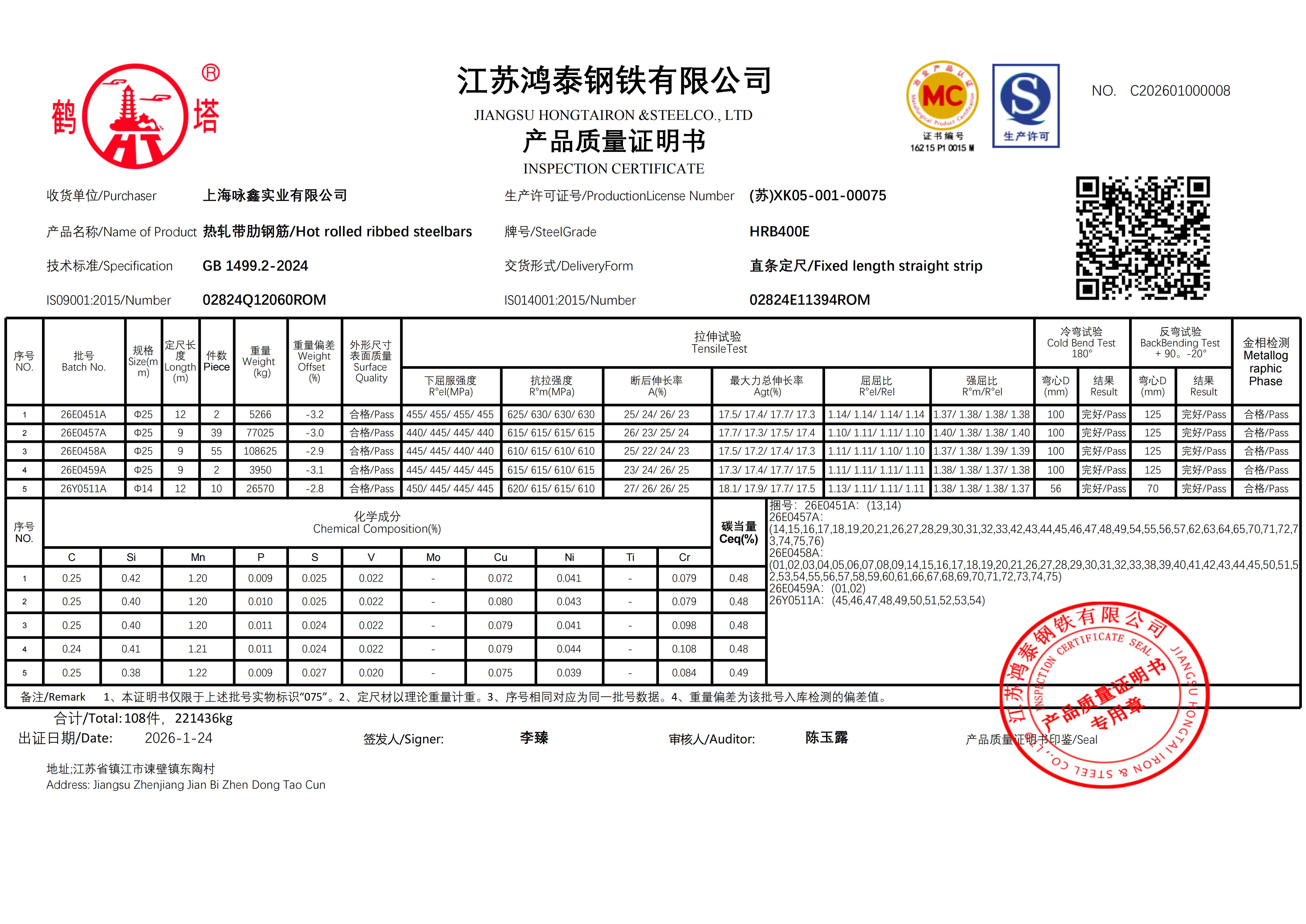 江苏鸿泰钢铁有限公司 C202601000008上海咏鑫实业有限公司NO