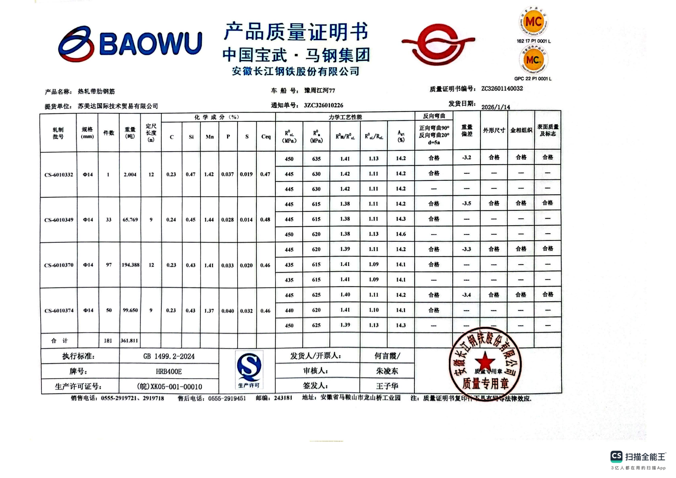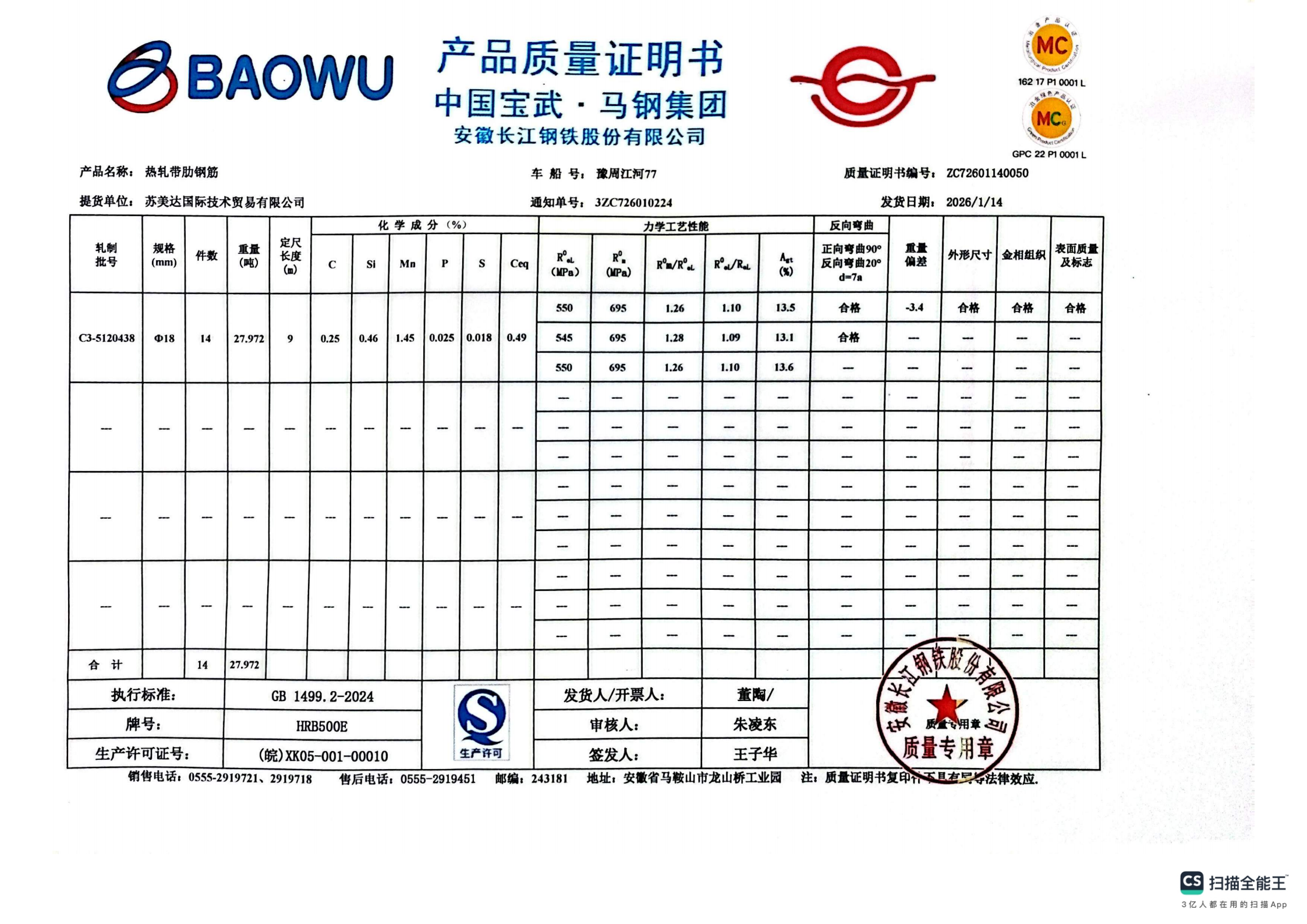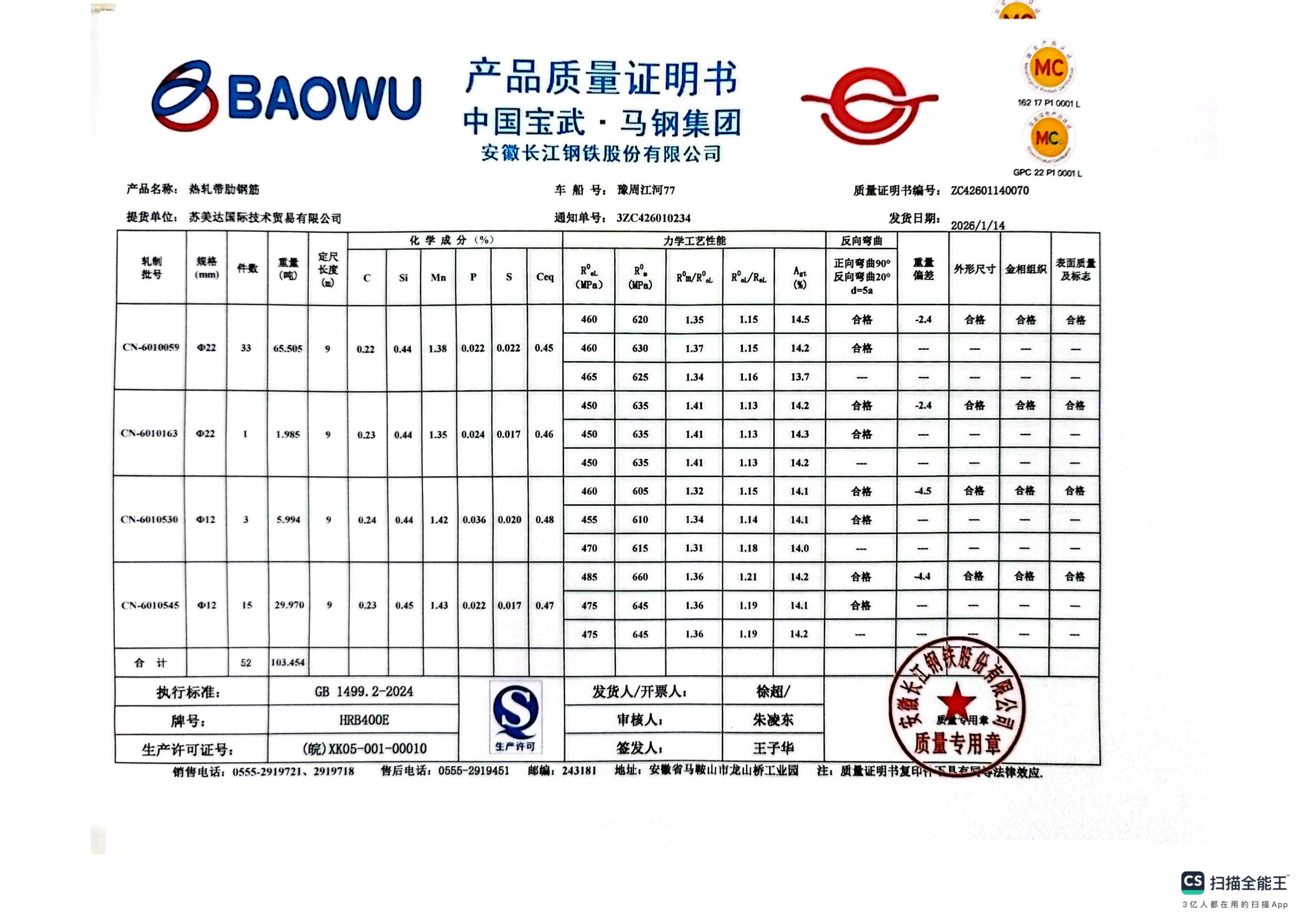 安徽长江钢铁股份有限公司提货单位:苏美达国际技术贸易有限公司