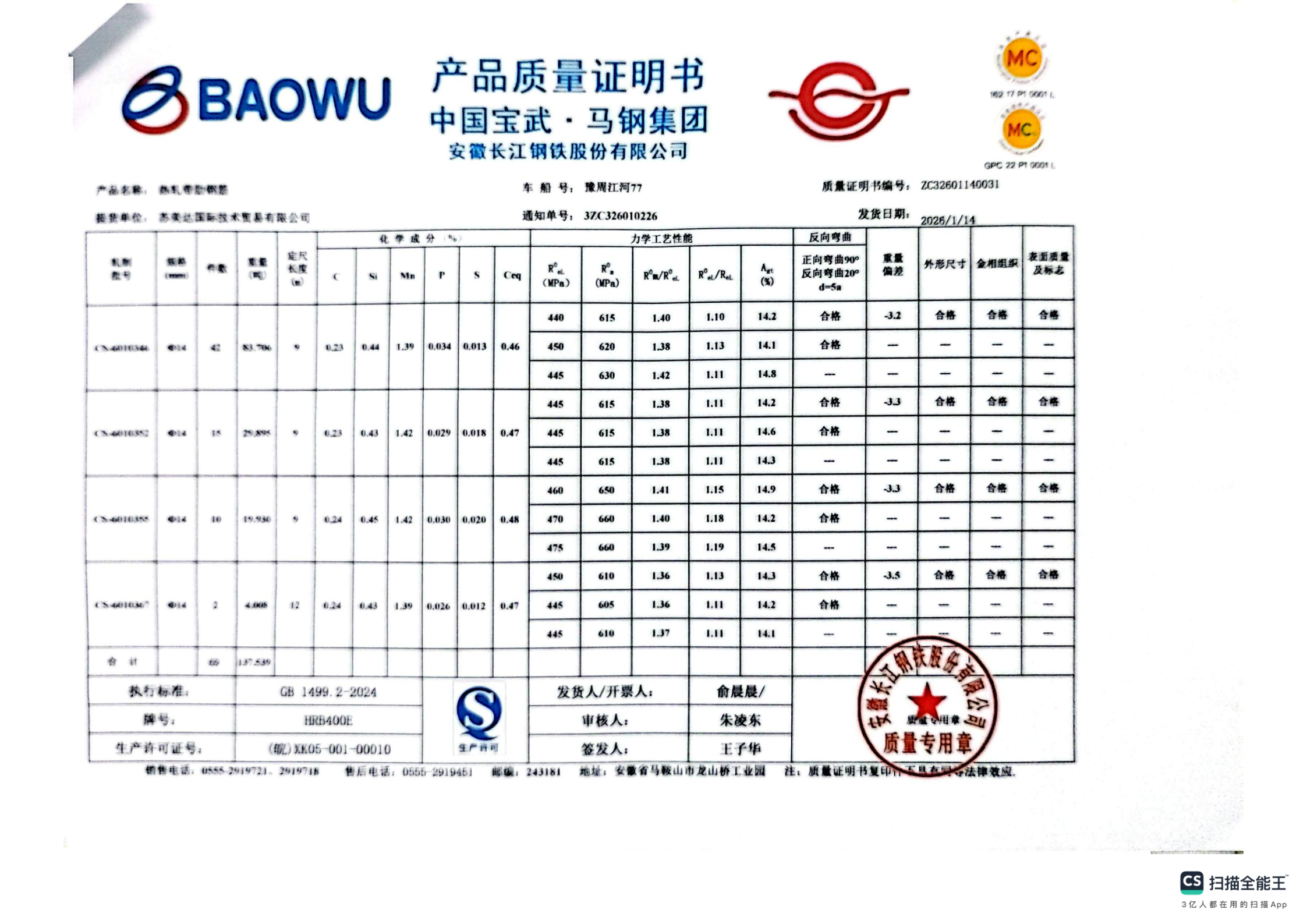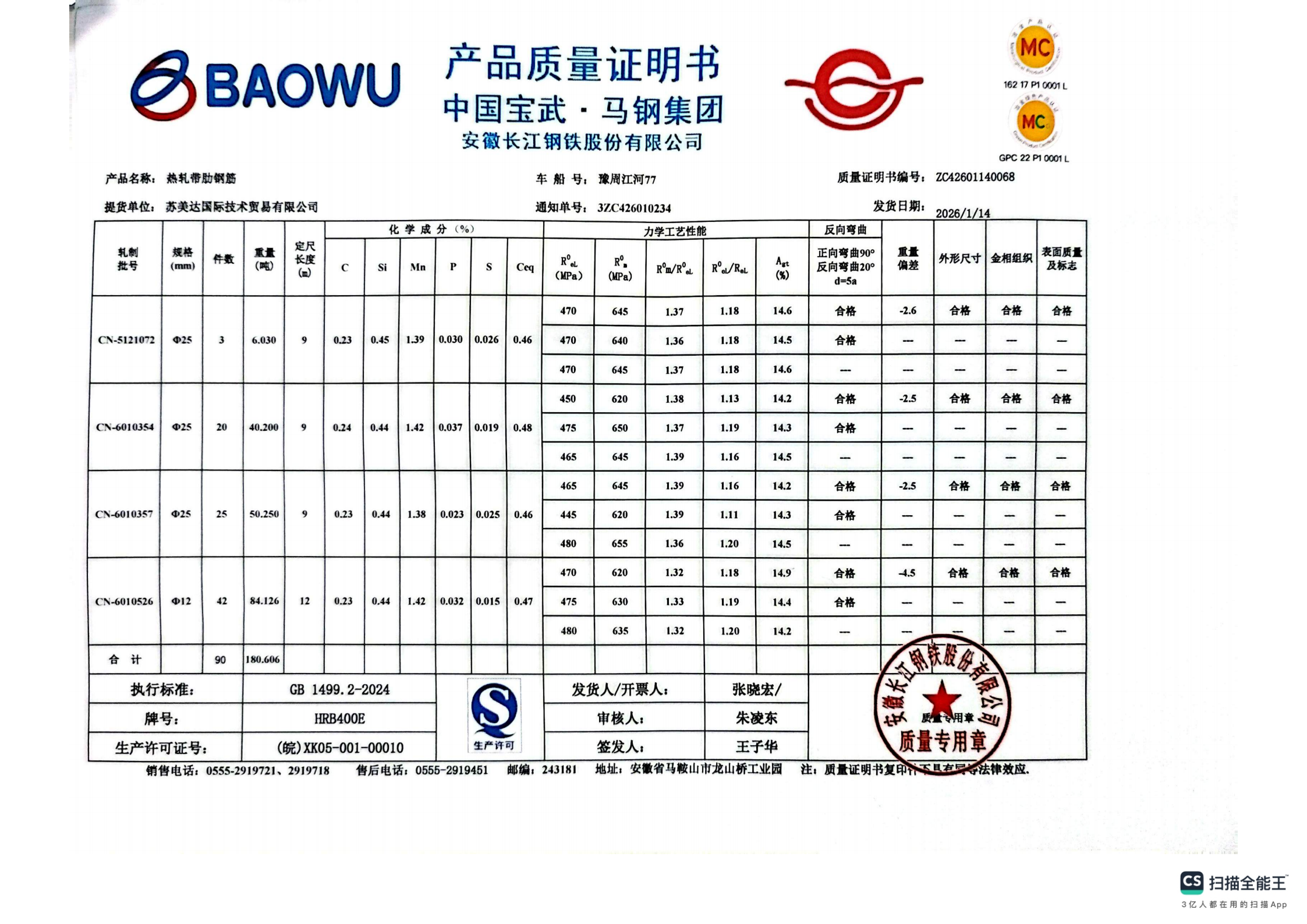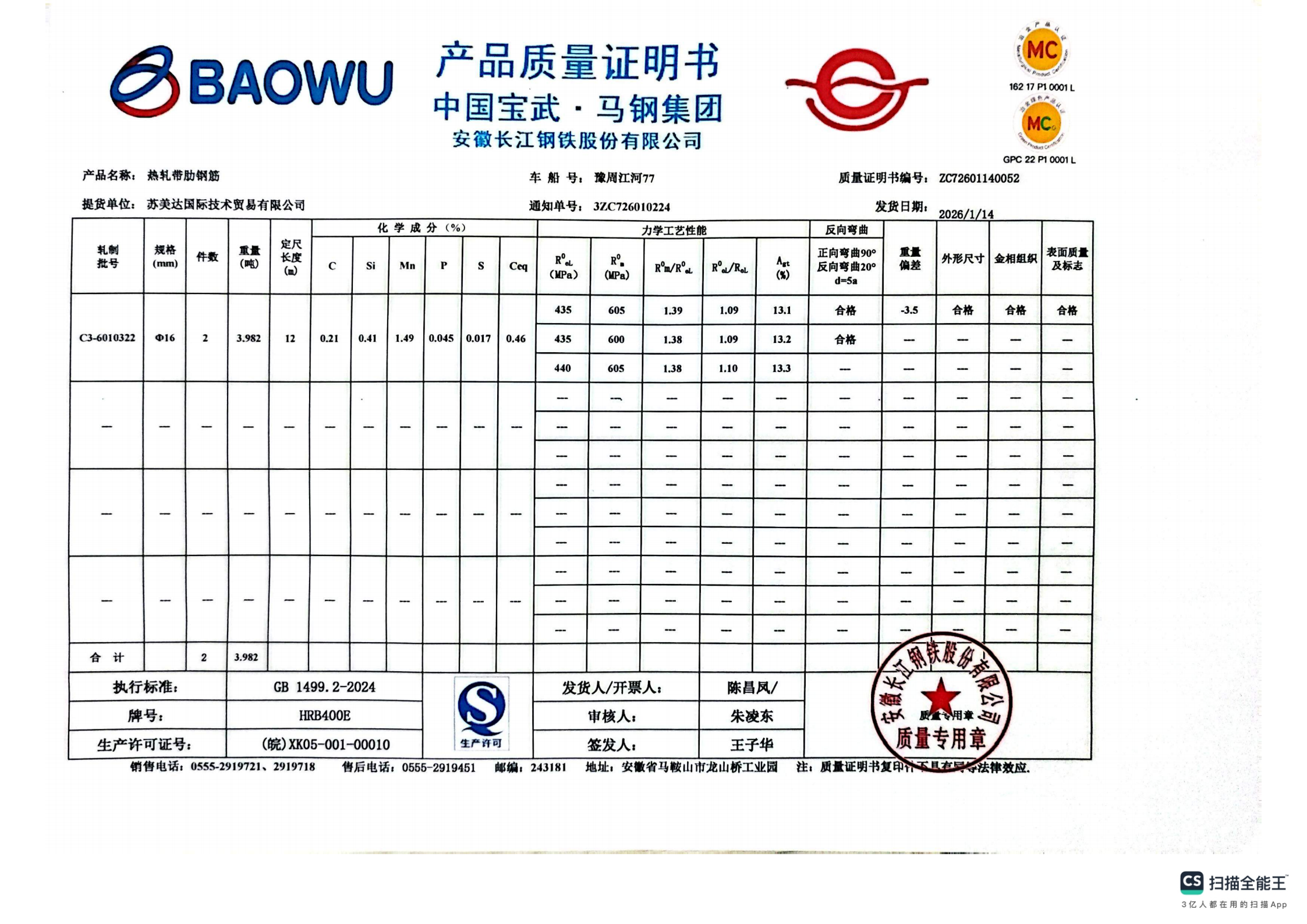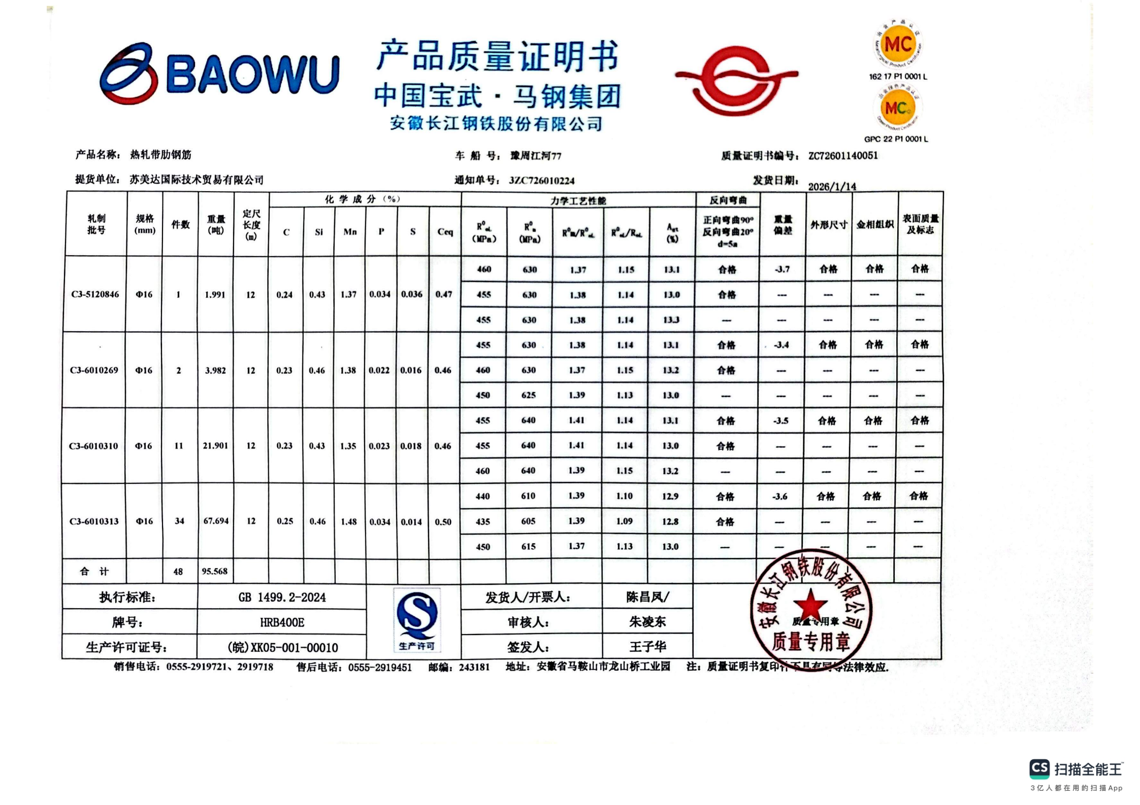 安徽长江钢铁股份有限公司提货单位:苏美达国际技术贸易有限公司